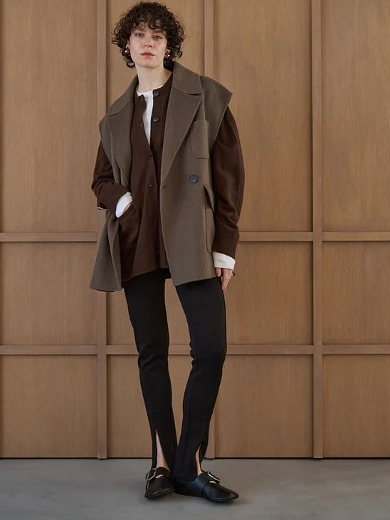 ミリタリーベストをデザインソールとしたポケットデザインがポイントで、エレガンスになりがちなリバーベストにカジュアル感をプラスしました。
