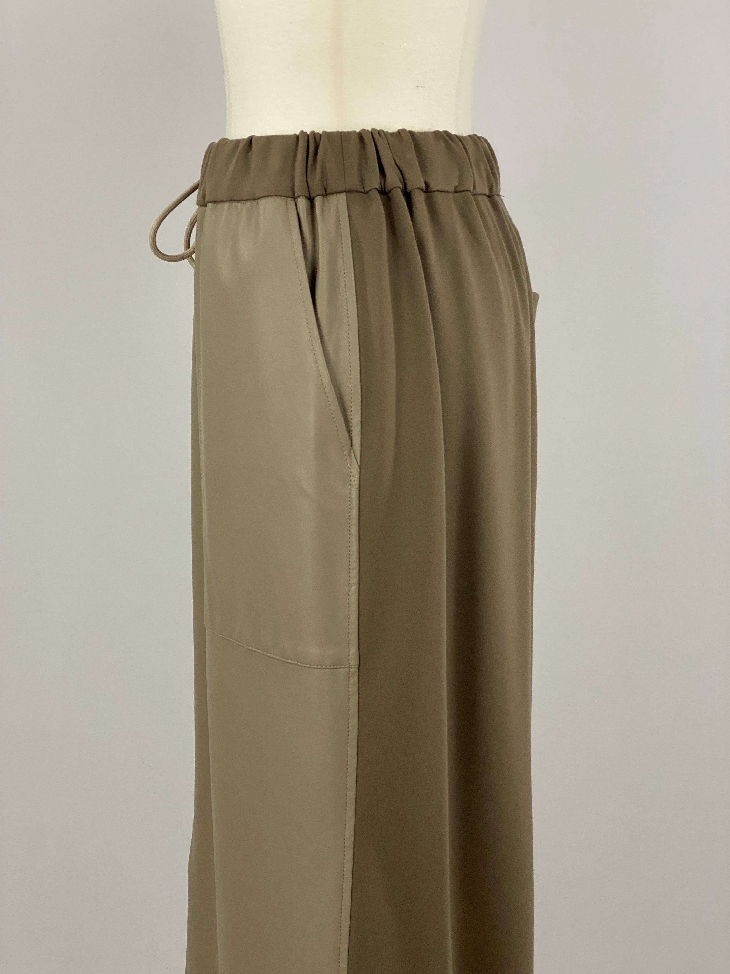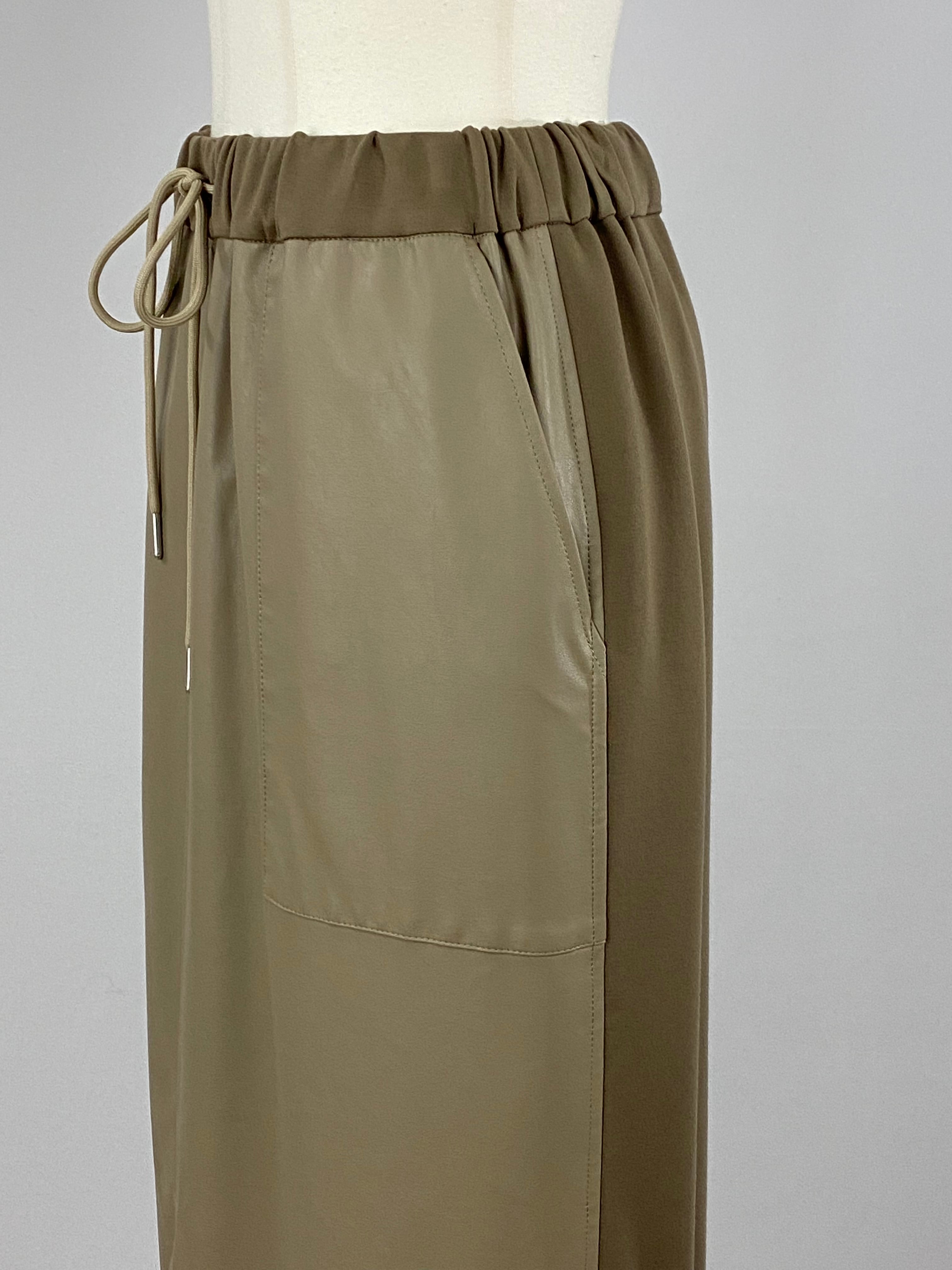 シンプルなベイカースカートのデザインですが、フロントはフェイクレザー、後ろはカットソー素材の、大胆な異素材使いになっております。