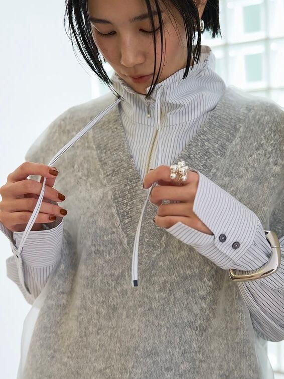 アノラック風のデザインのシャツで、衿を開いてゆるっと抜け感のある首元にしたり、