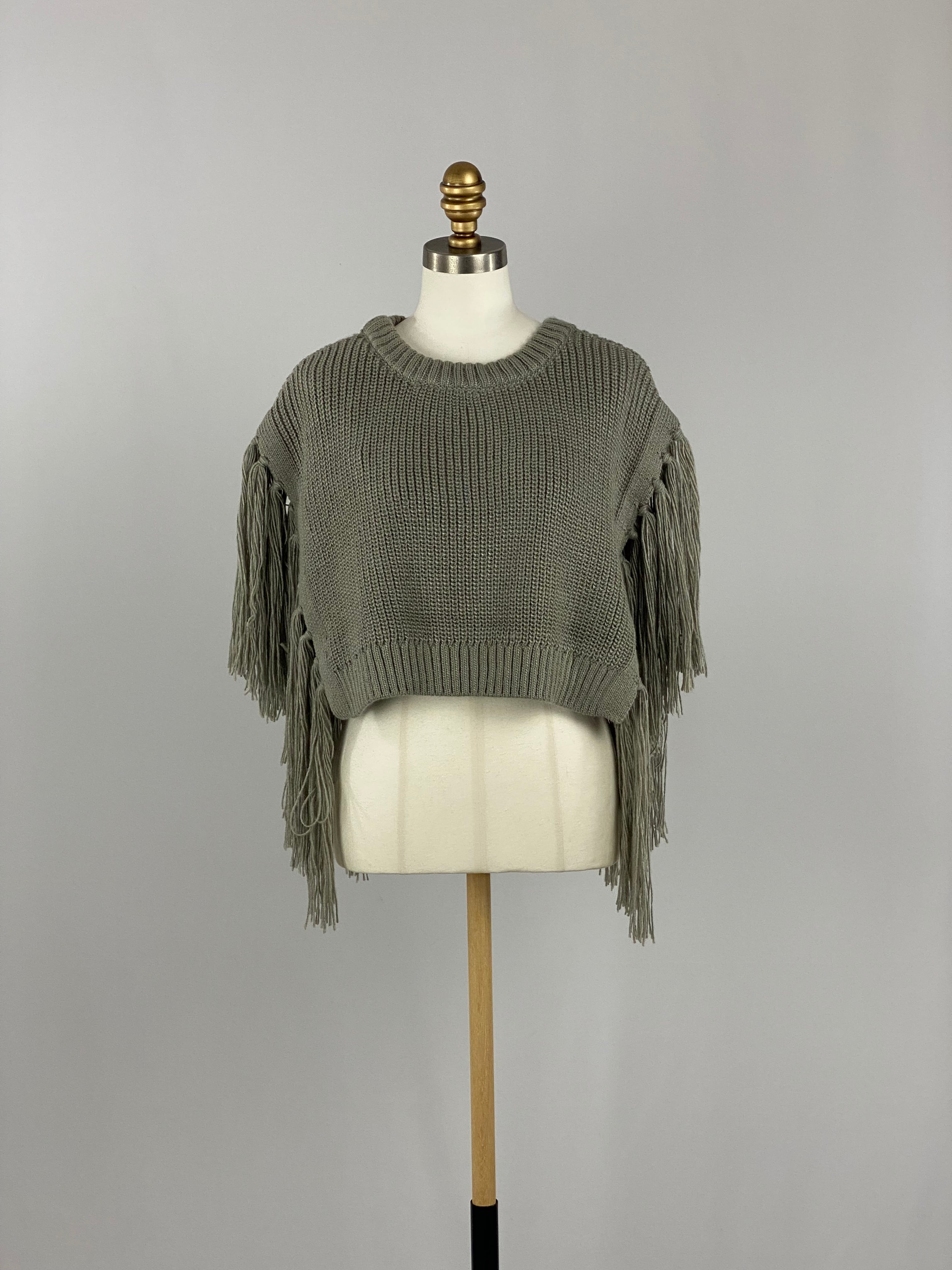 袖に施した存在感のあるフリンジと短丈の畦編み身頃が絶妙なバランスで今年らしいコーディネートのアクセントに