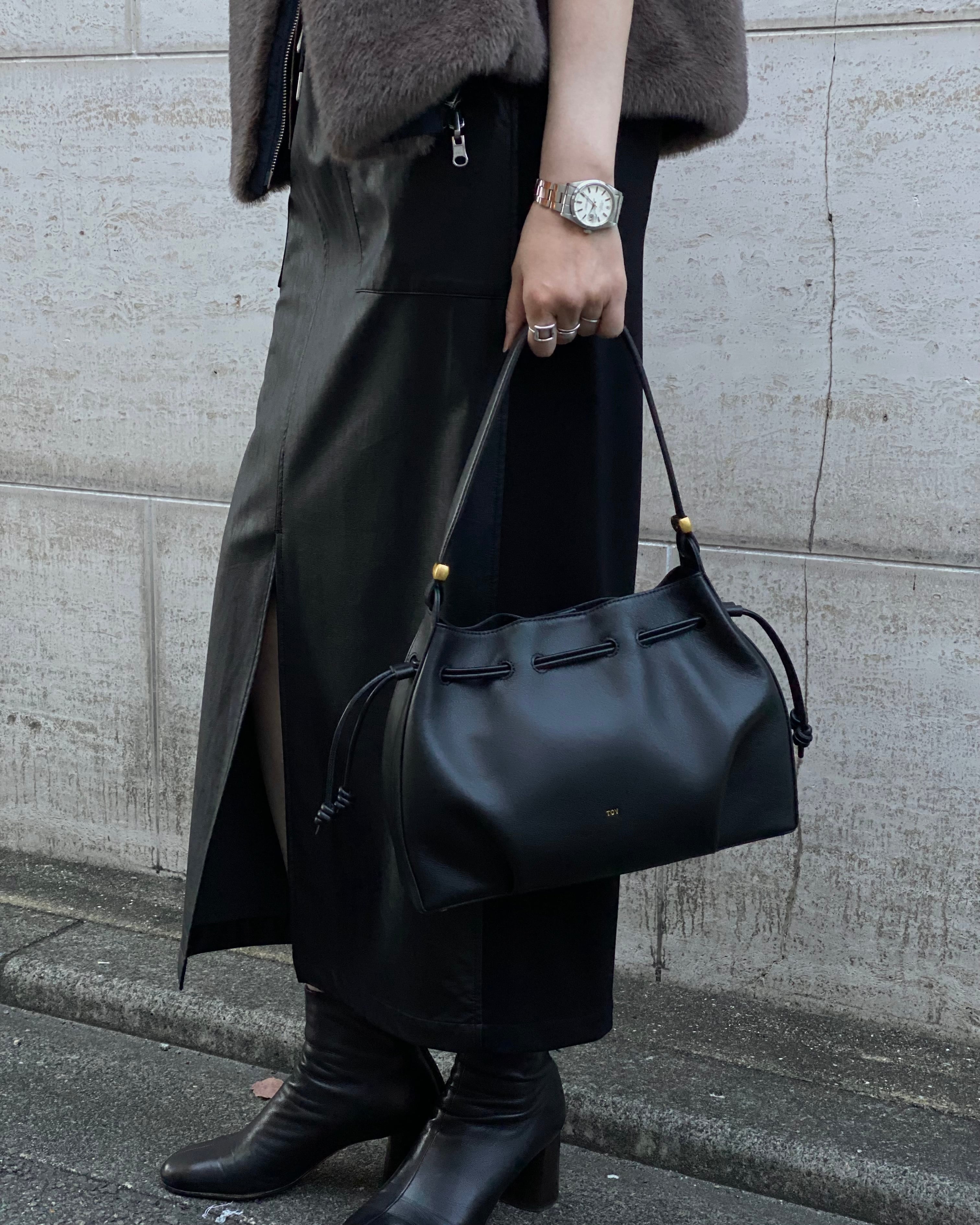 柔らかく滑らかなカウレザーを使用し、紐をしめると立体的な丸みが美しい横長巾着バッグです。