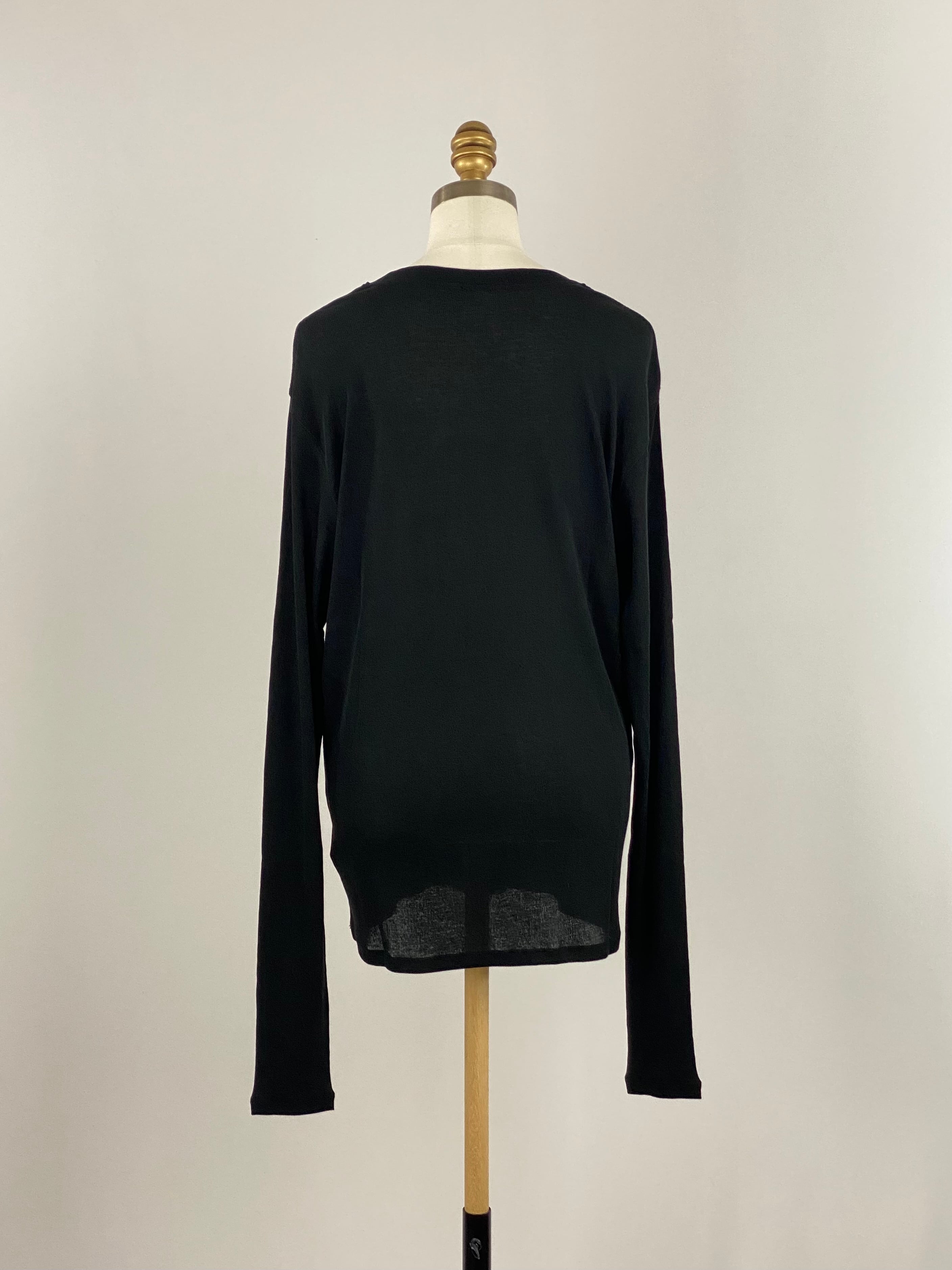 袖は長めに設定、袖口にかけては細めの作りになっていて、ゆるっと手首にたまるデザインにしています。