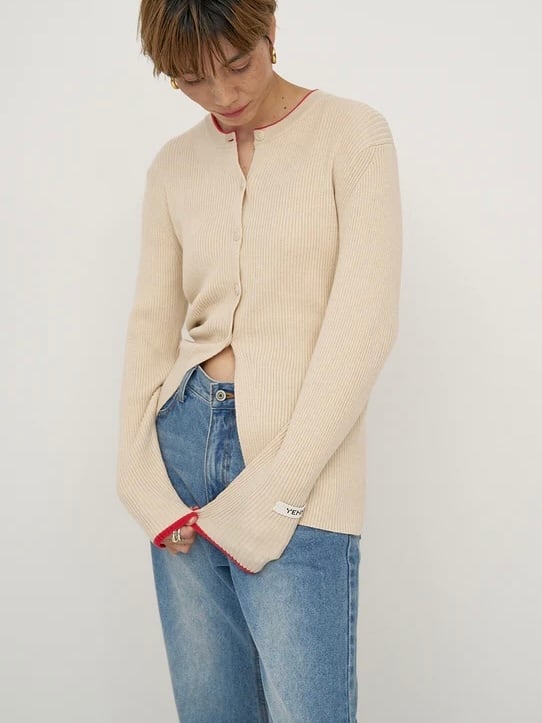ロゴチャームや“YENN”ロゴテープなども所々に散りばめて、デザイン要素を盛り込んだニットカーディガンです。