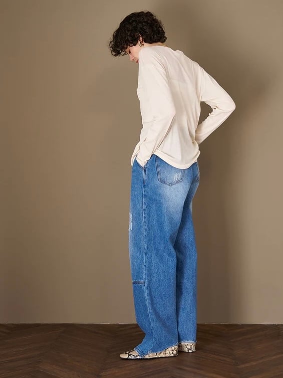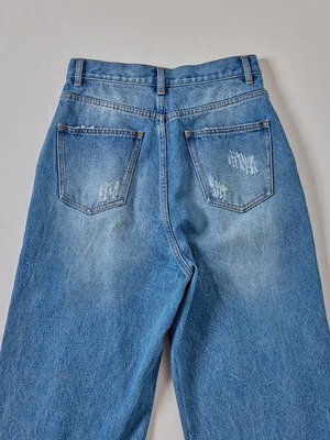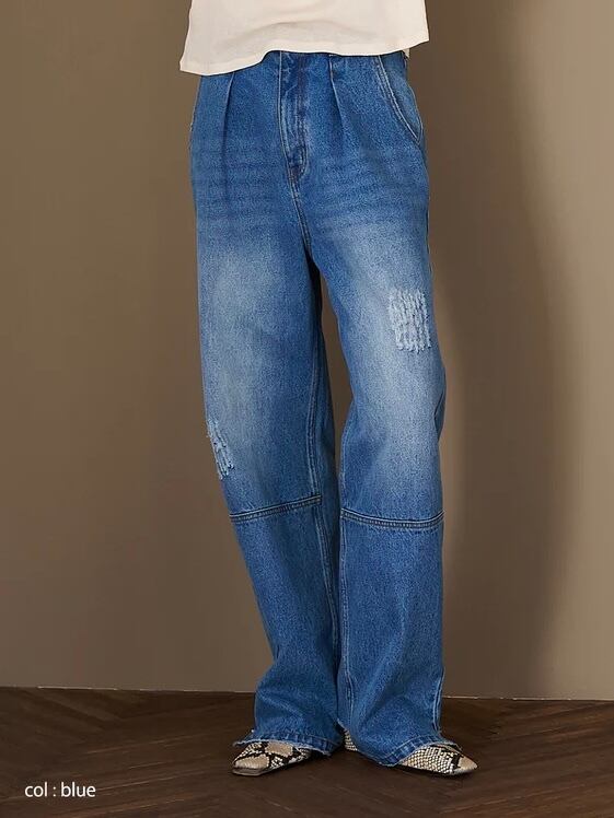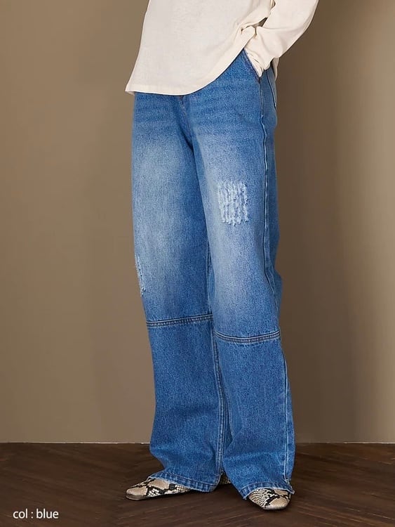 膝下にいれた切り替えデザインや、ところどことに施したさりげないダメージ加工など、こだわりのつまった1枚です。