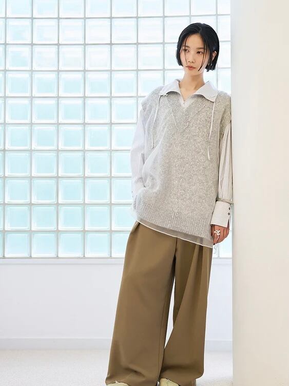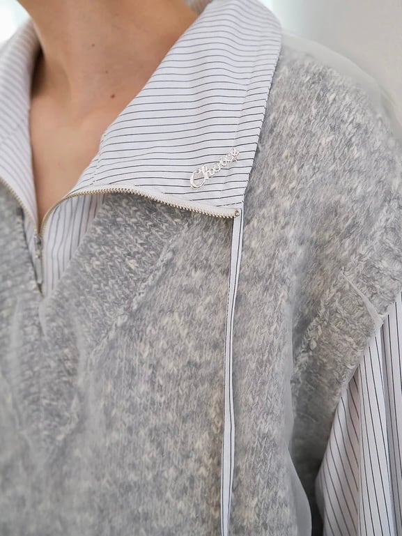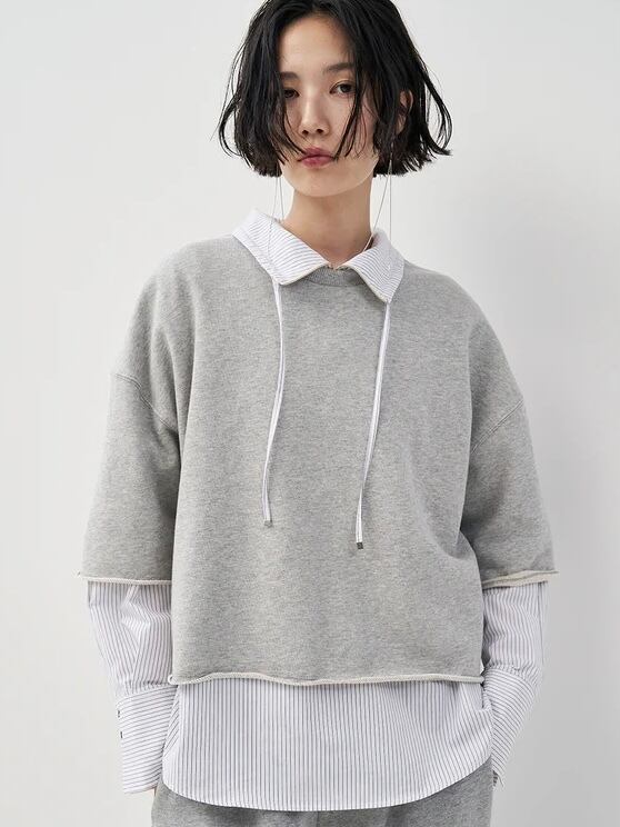 アノラック風のデザインのシャツで、衿を開いてゆるっと抜け感のある首元にしたり、
