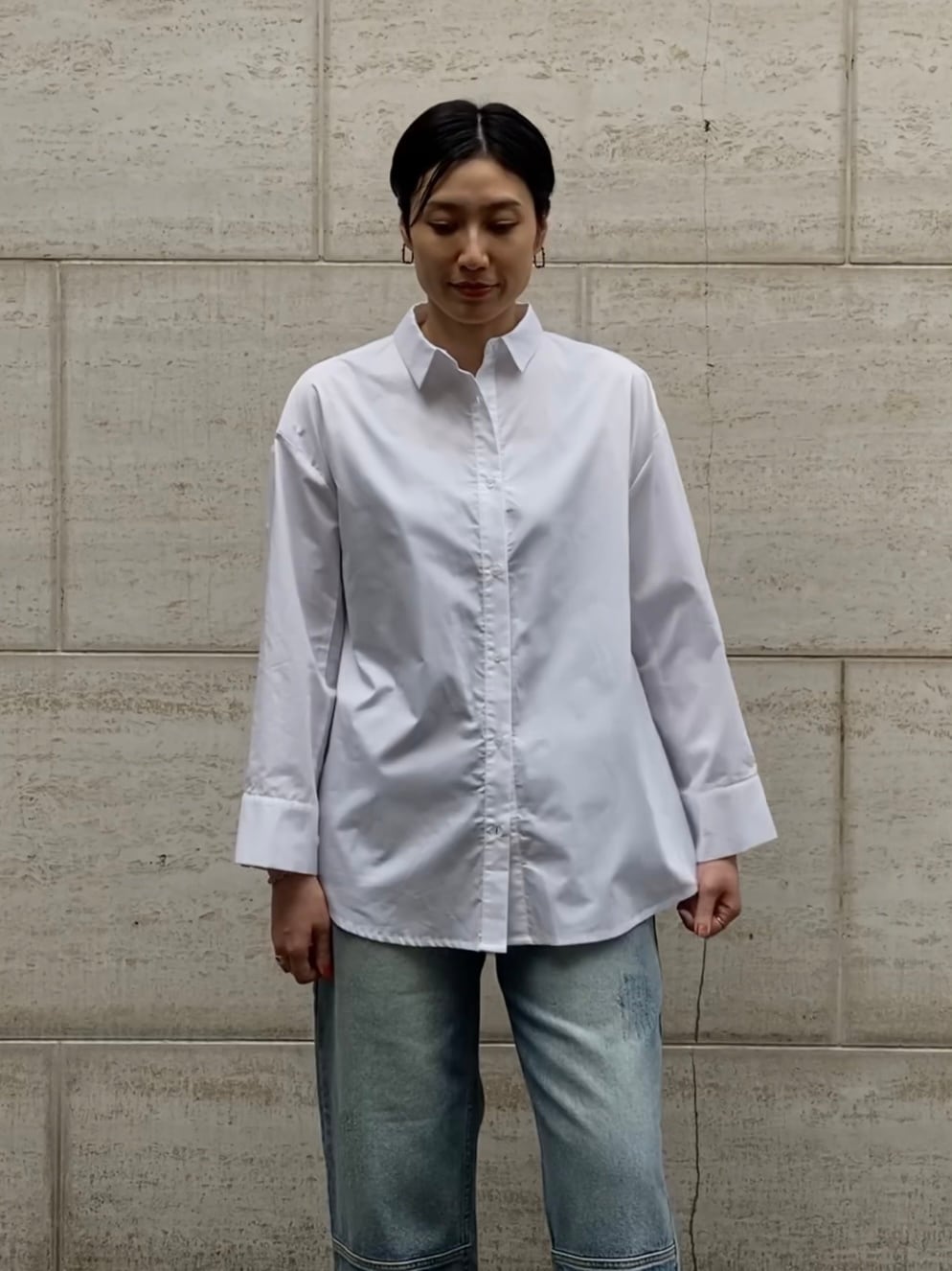 ゆったりとしたサイズ感と後ろ身頃のスリットで硬くなりすぎない抜け感を演出。