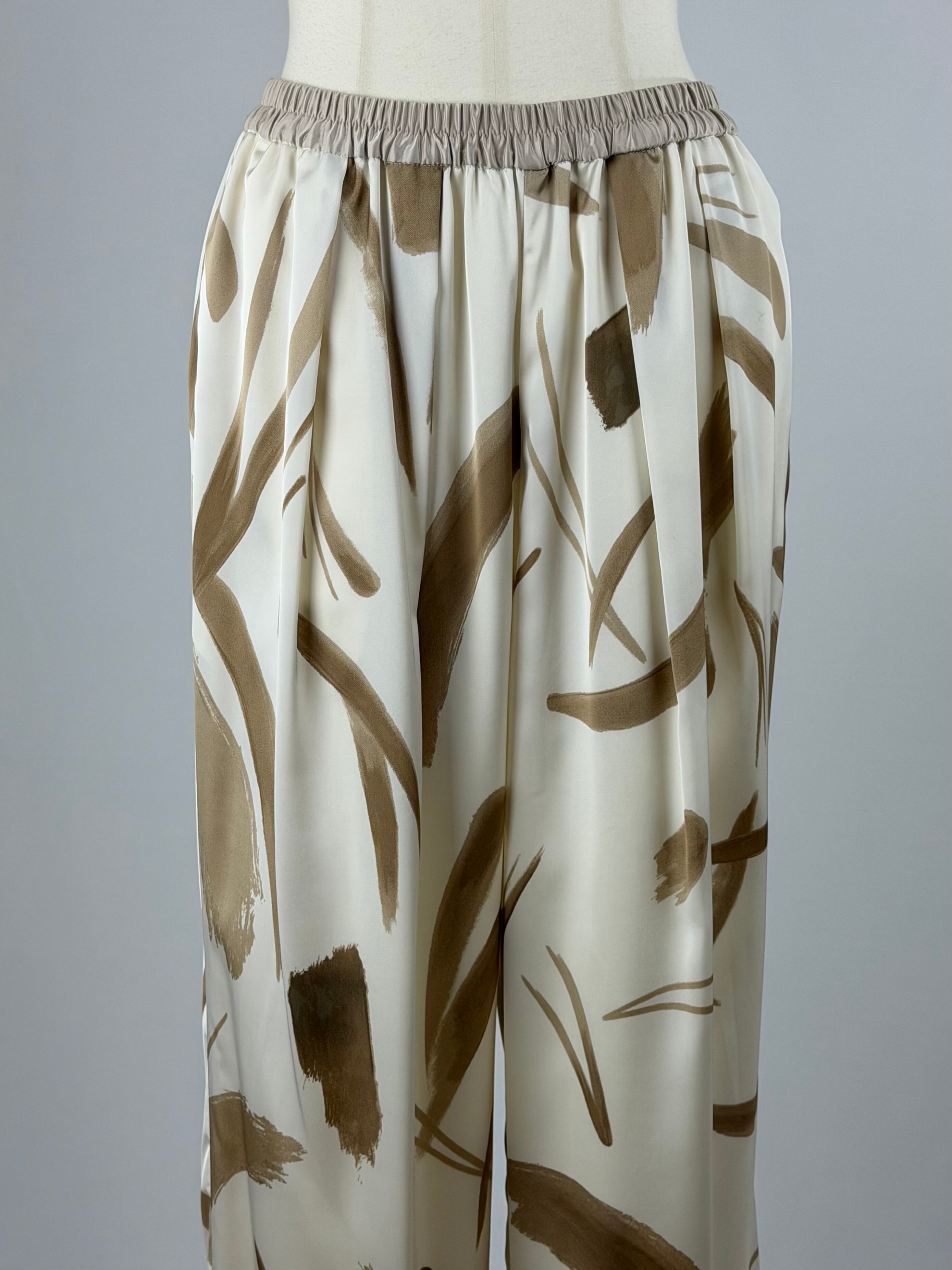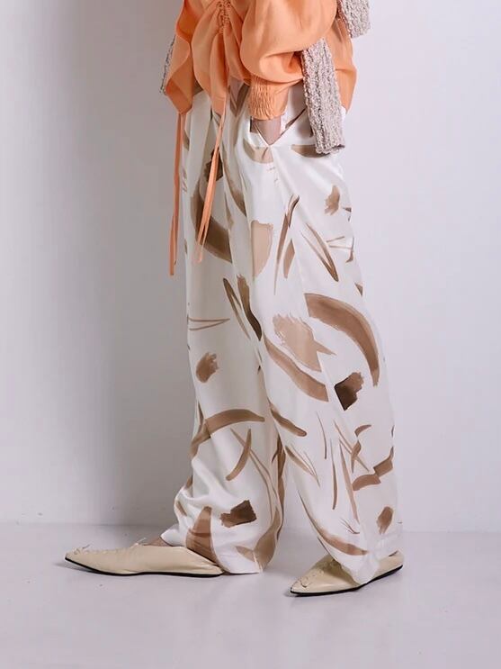 手書き風の大判な抽象柄が目を引く、サテンタックパンツです。