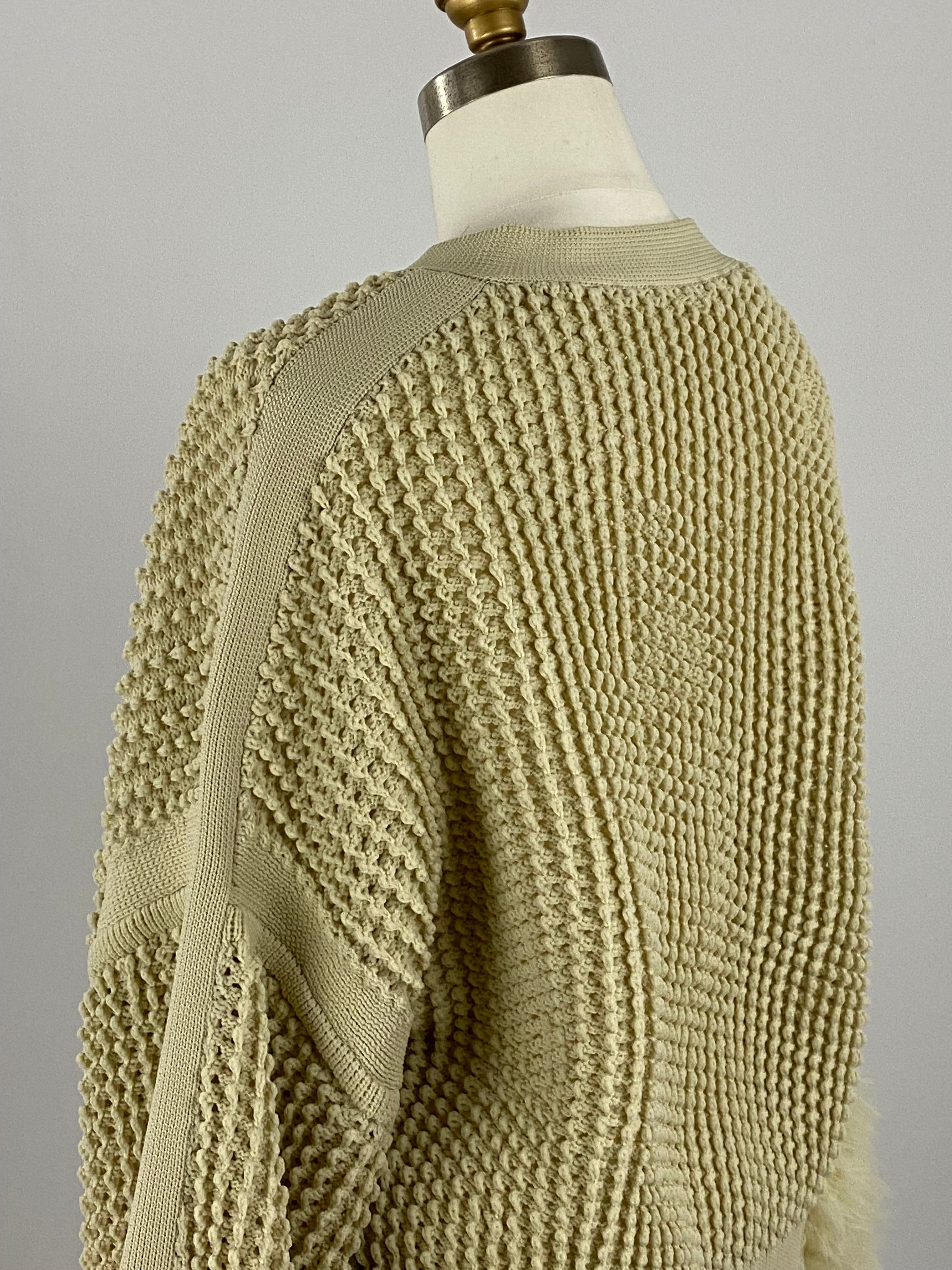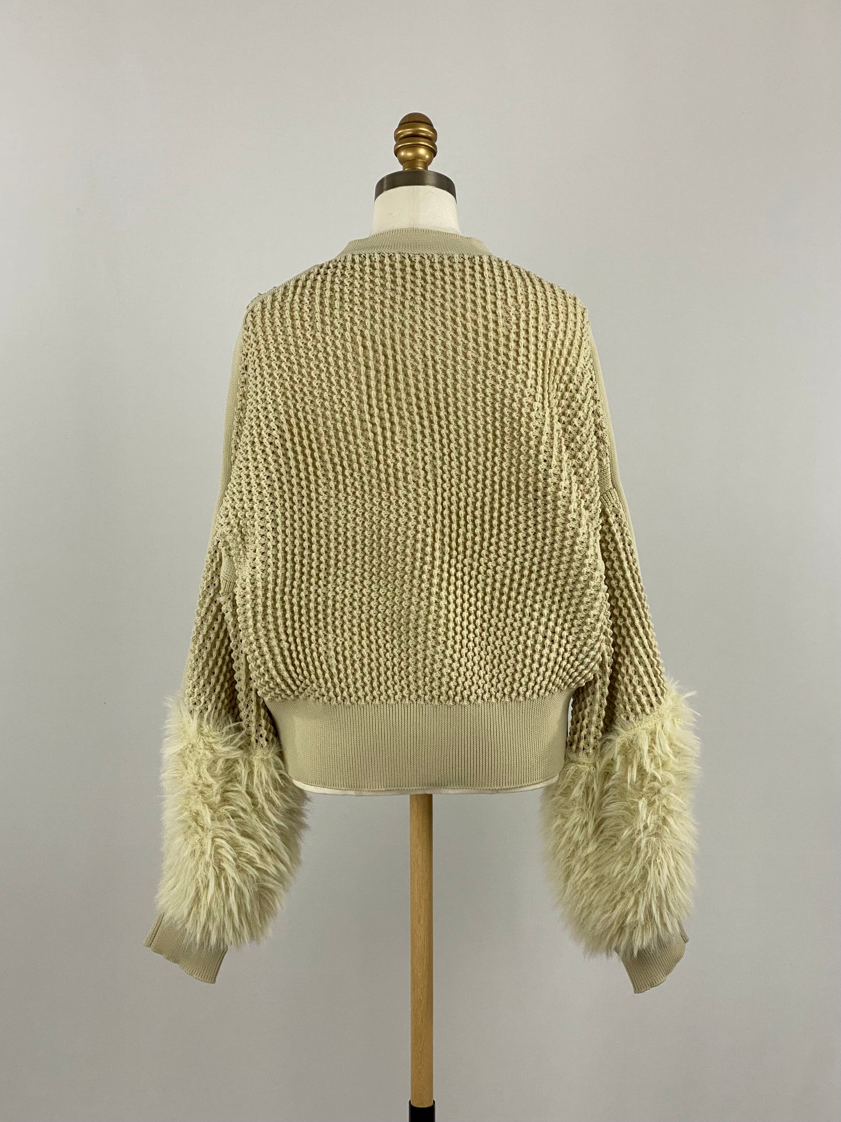 ポリエステルニットならではの軽さで、袖にファー糸を編み込みドッキング。