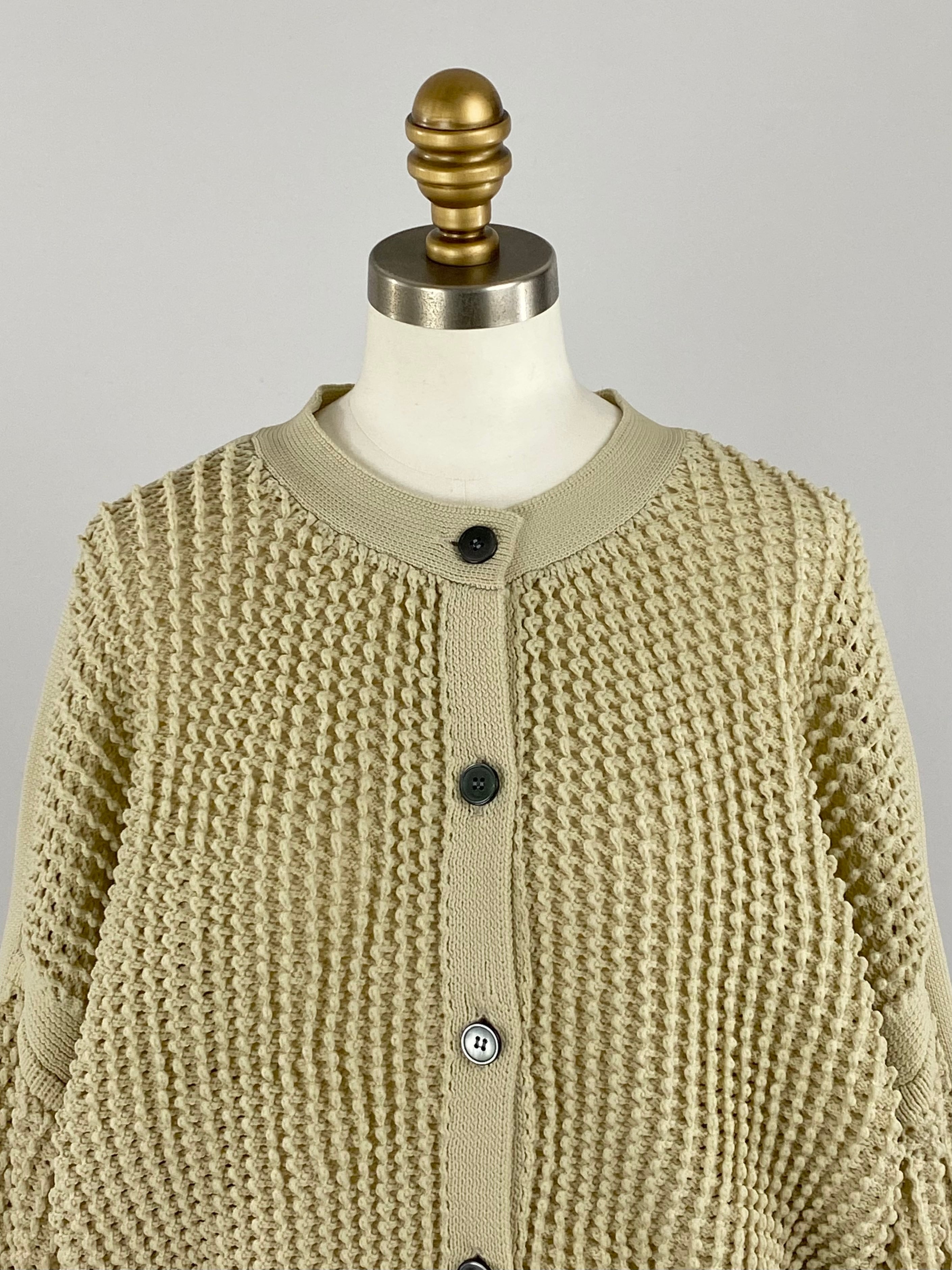 ふっくらとしたポリエステル糸を使用したポップコーンニットカーディガン。
