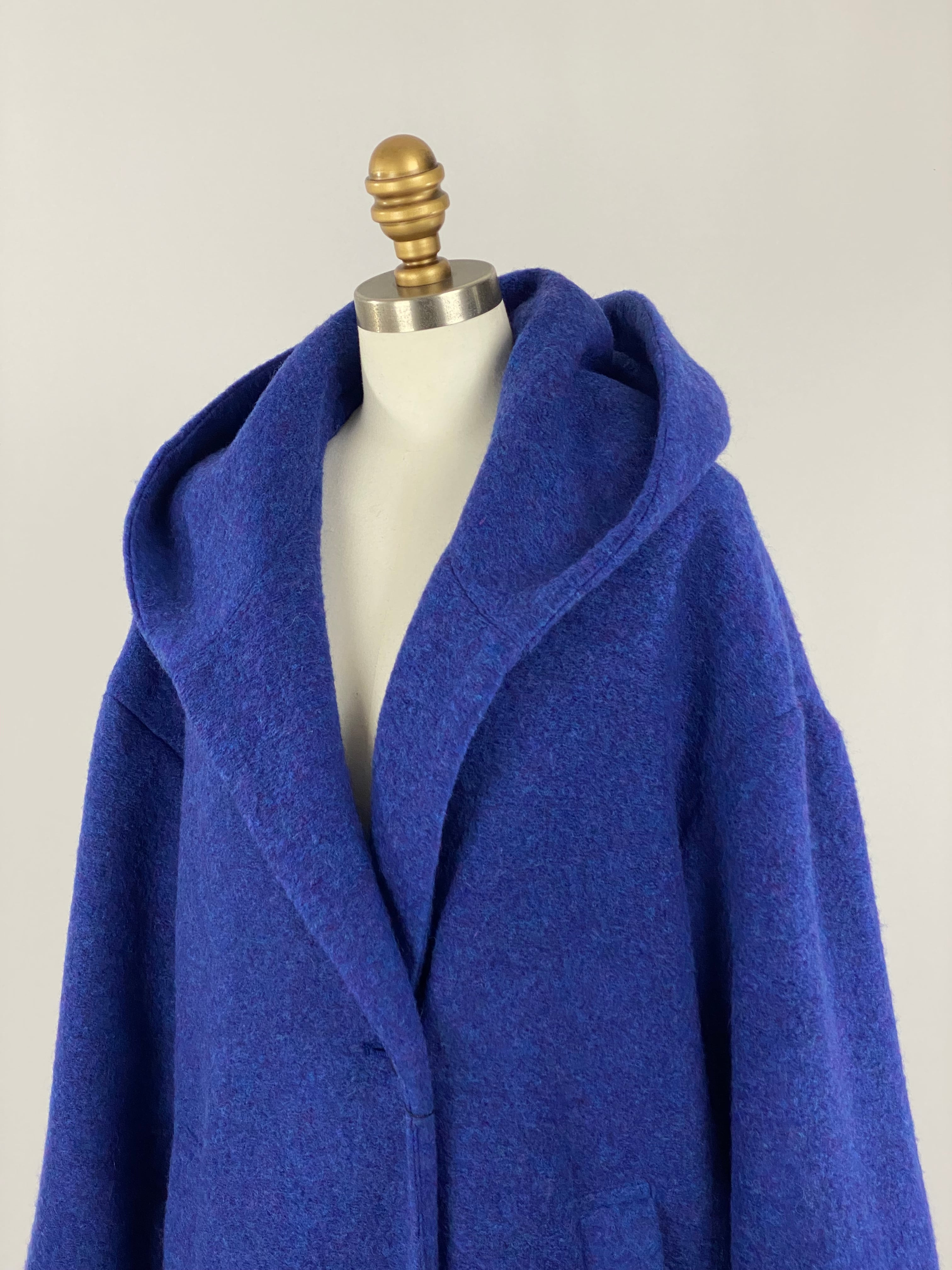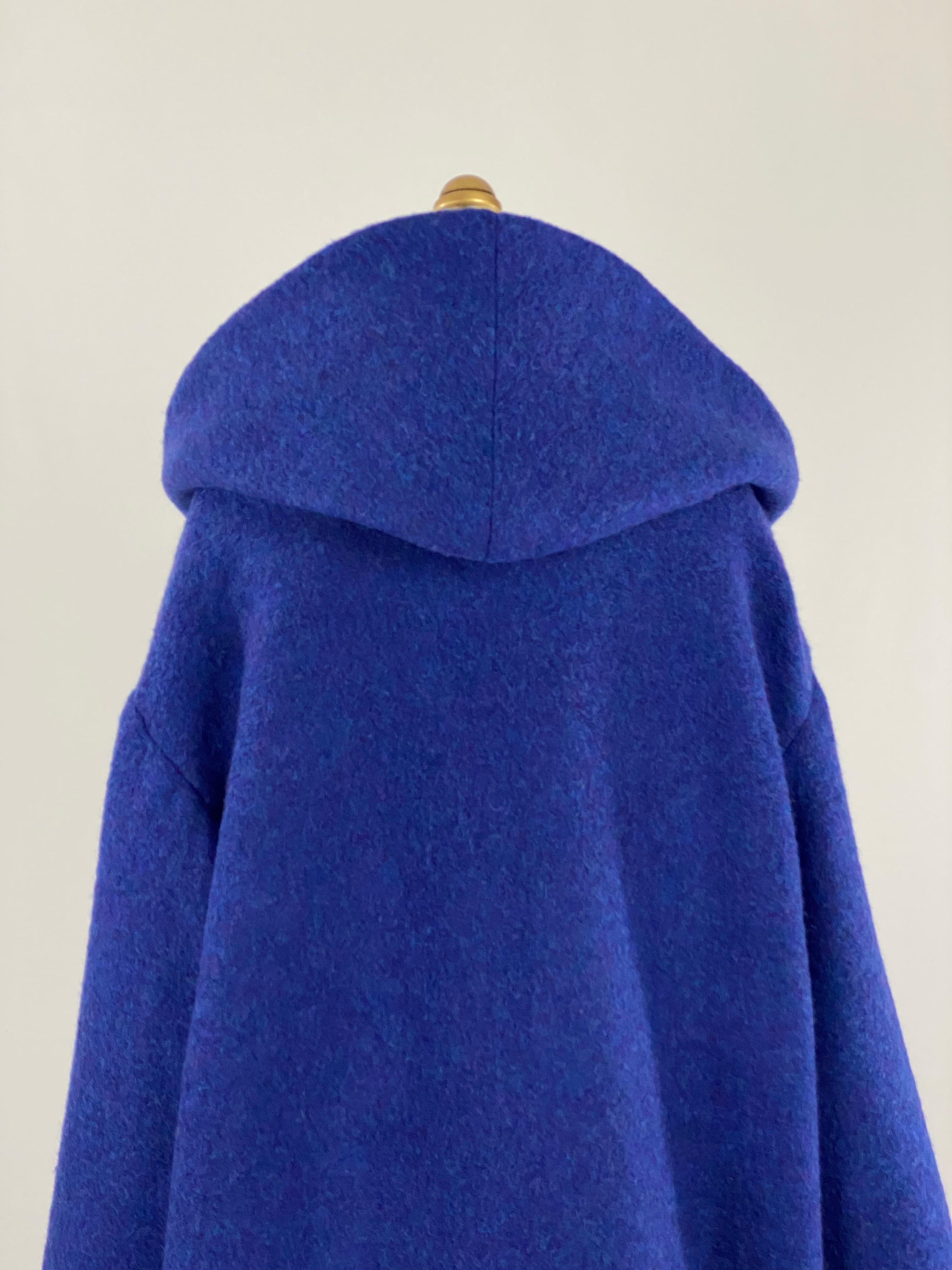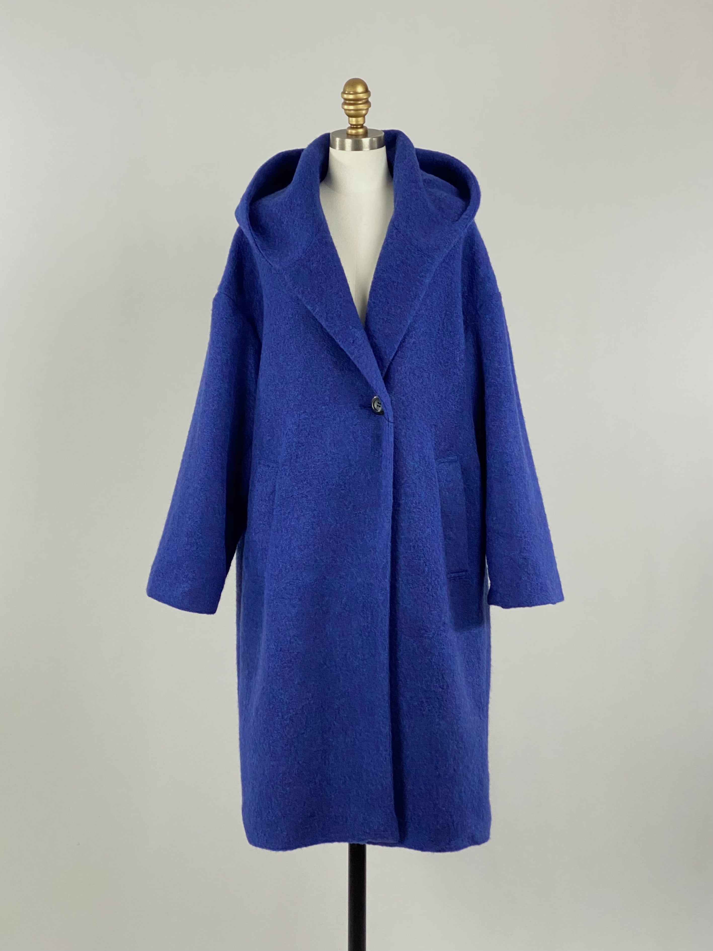 大きなフード風のショールカラーがアイコニックなセミロングコート。