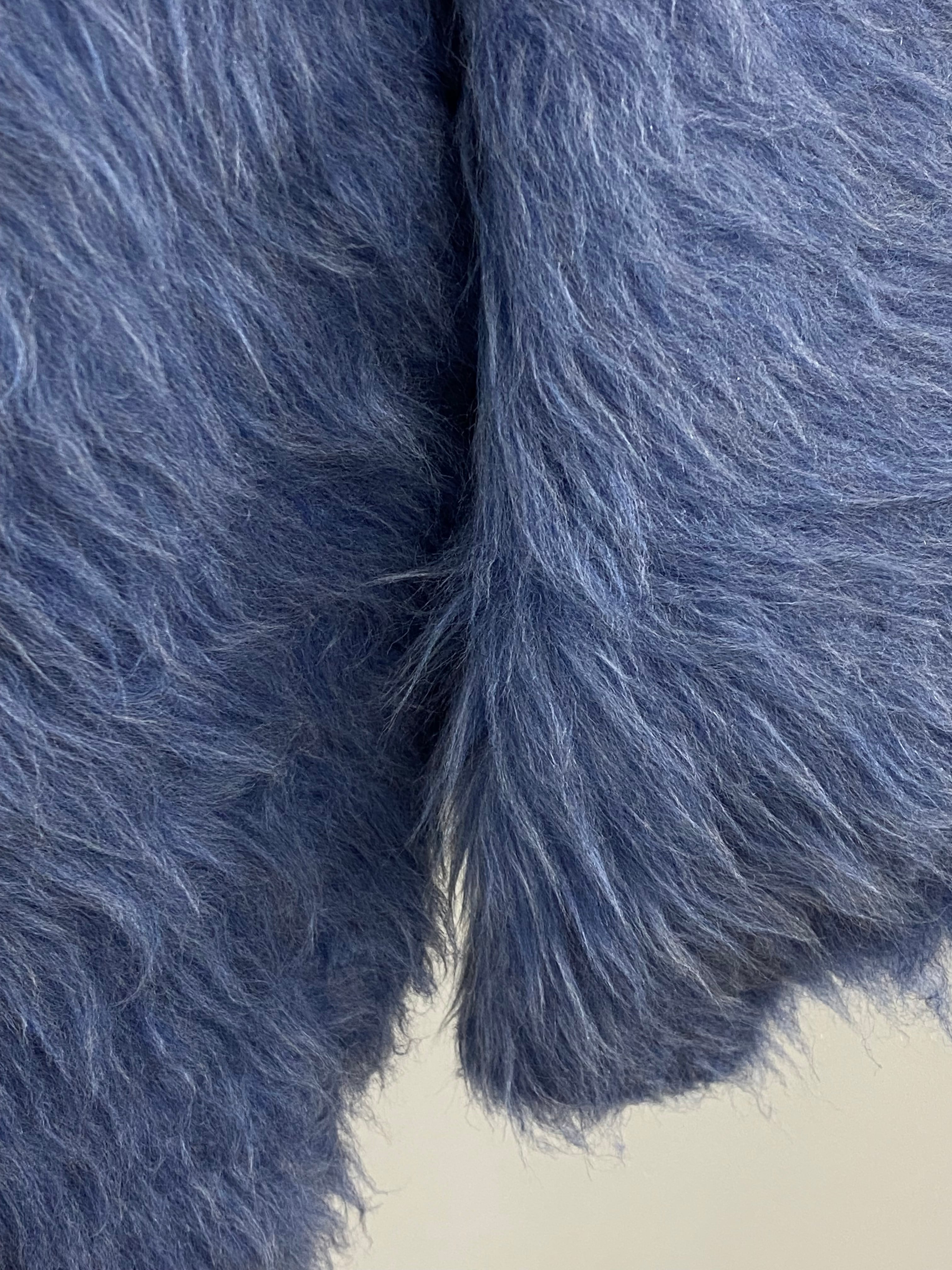 毛足の長いシャギー風の加工を施し、ラグジュアリー感を持たせることによってニットのカジュアル感を軽減し、アウター感覚で着用できるアイテムに仕立てています。