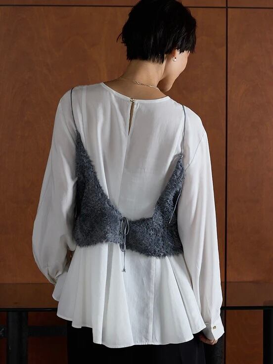 華奢なショルダーストラップと背中のリボンディテールが、女性らしさを引き立ててくれて、シャツやタートルにレイヤードスタイルに取り入れていただける万能なレイヤードアイテムになります。