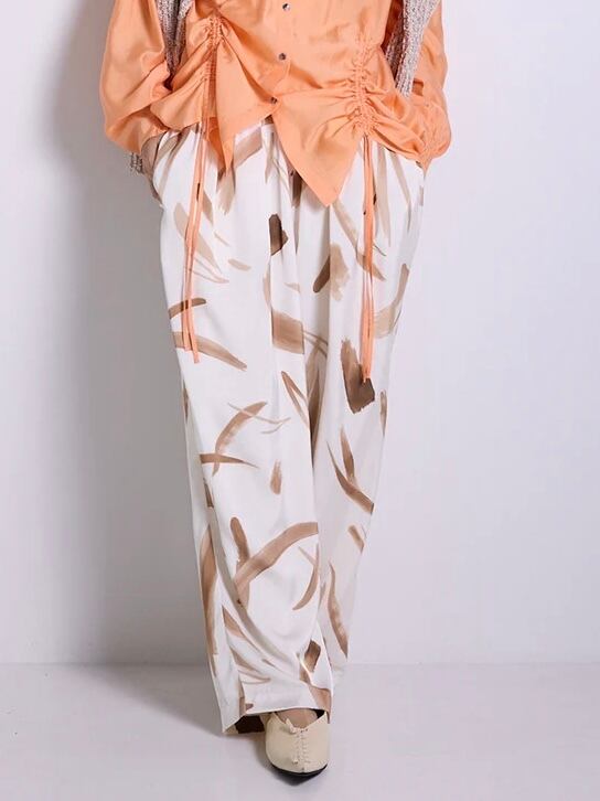 手書き風の大判な抽象柄が目を引く、サテンタックパンツです。