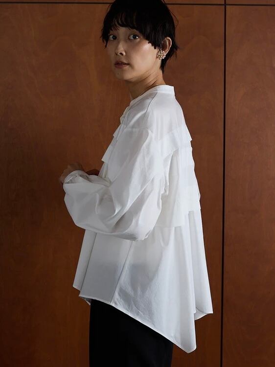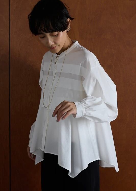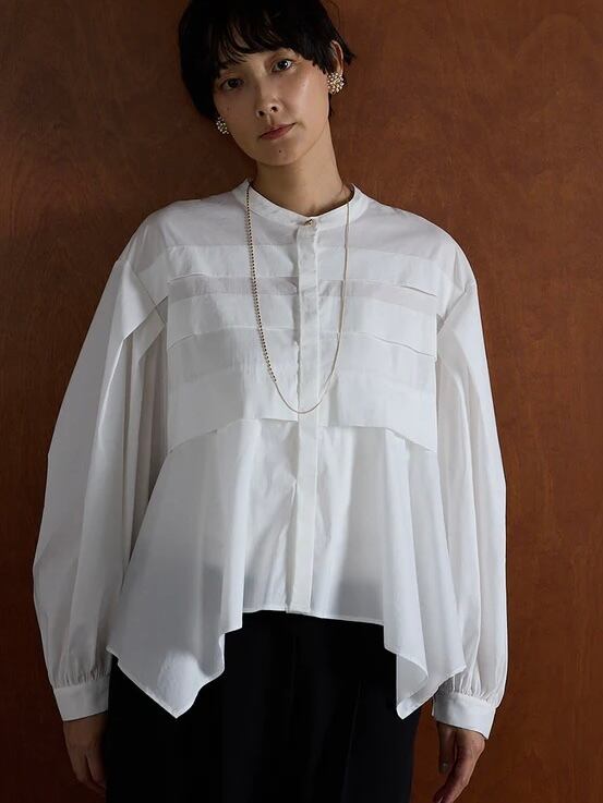 太めのピンタックと裾のレギュラーヘムがポイントのフレアシャツ。