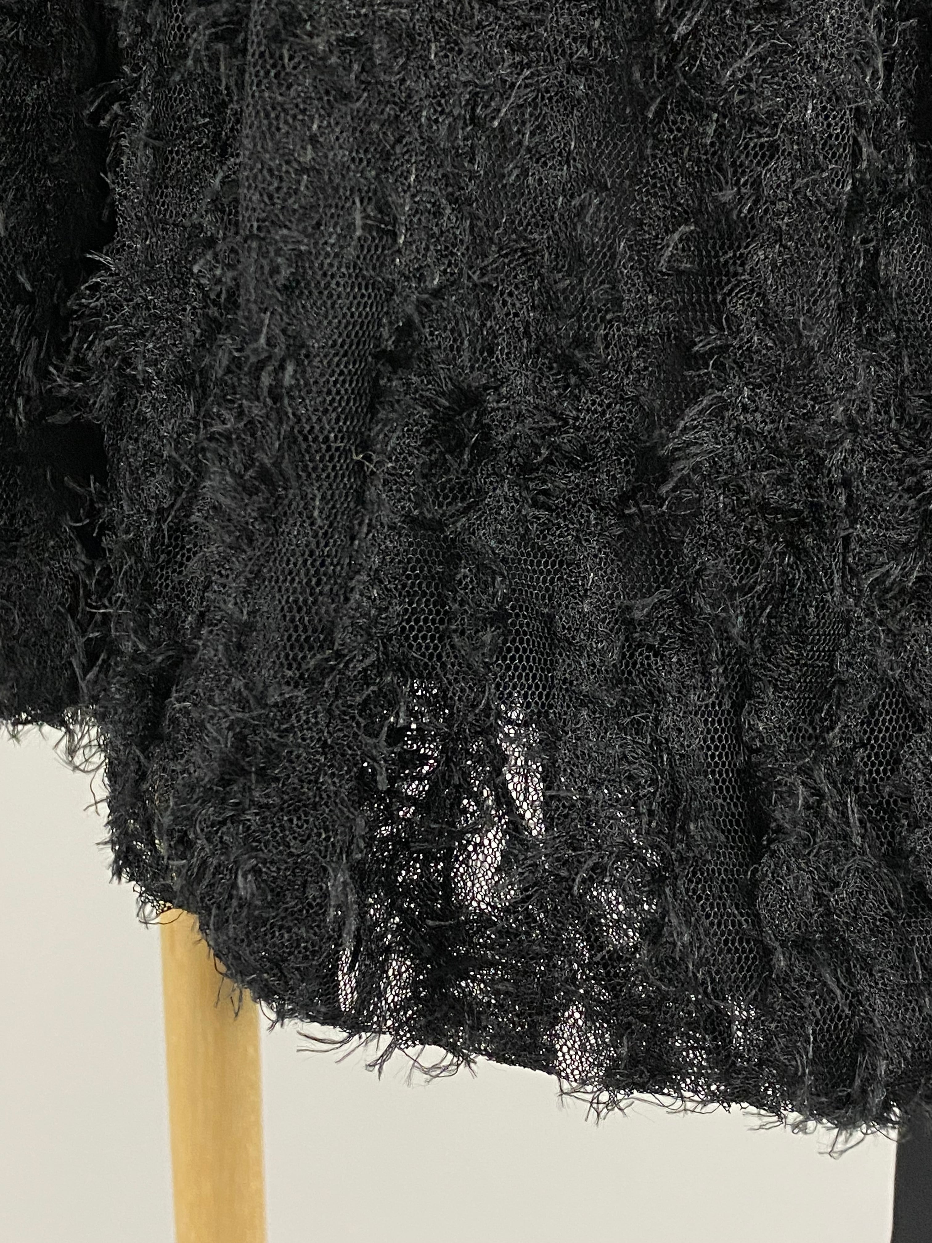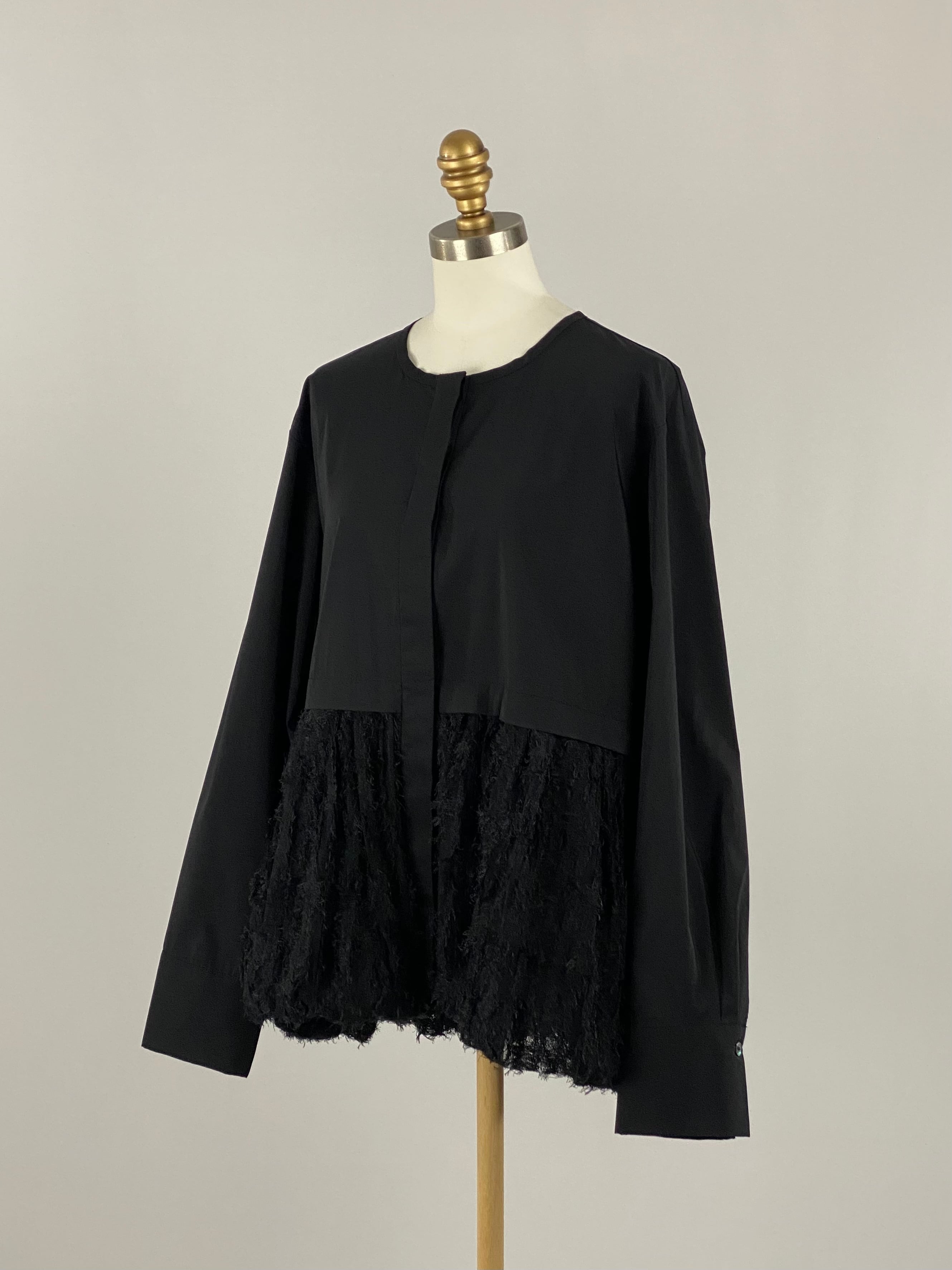 毛足のあるファー素材を裾に切り替えた、華やかなデザインシャツ。