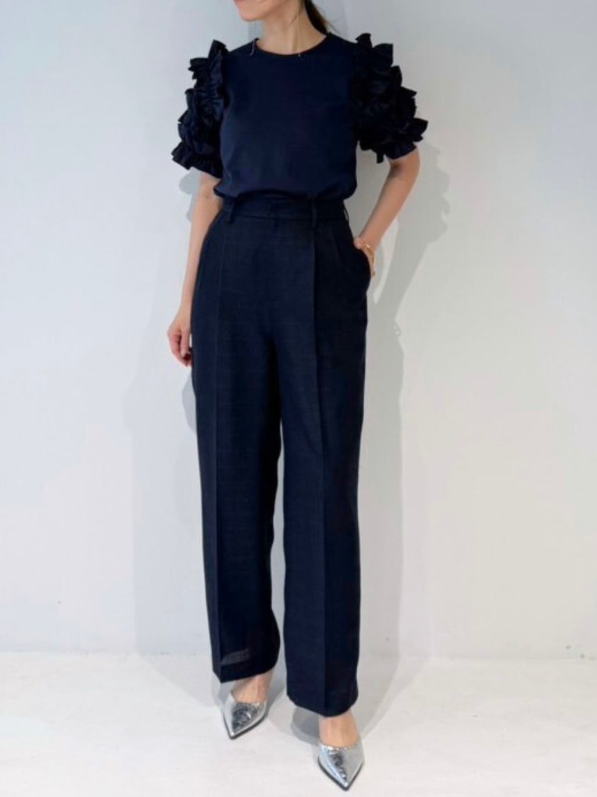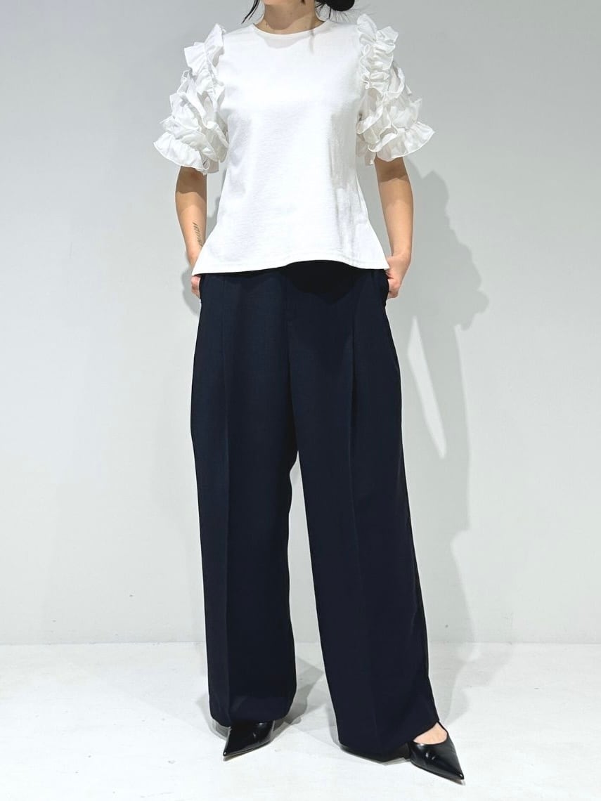 ゆったりとしたワイドシルエットに2タックを入れることで、マニッシュさと上品さを両立。