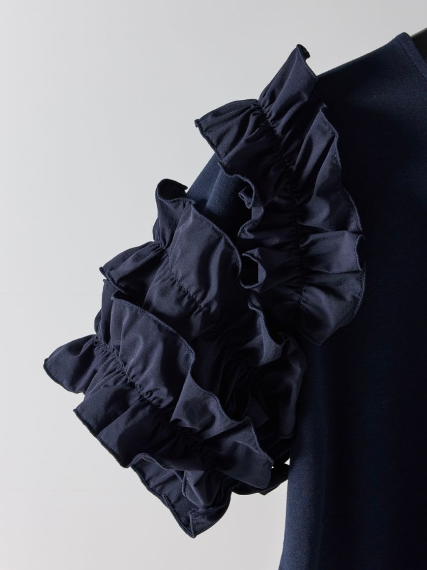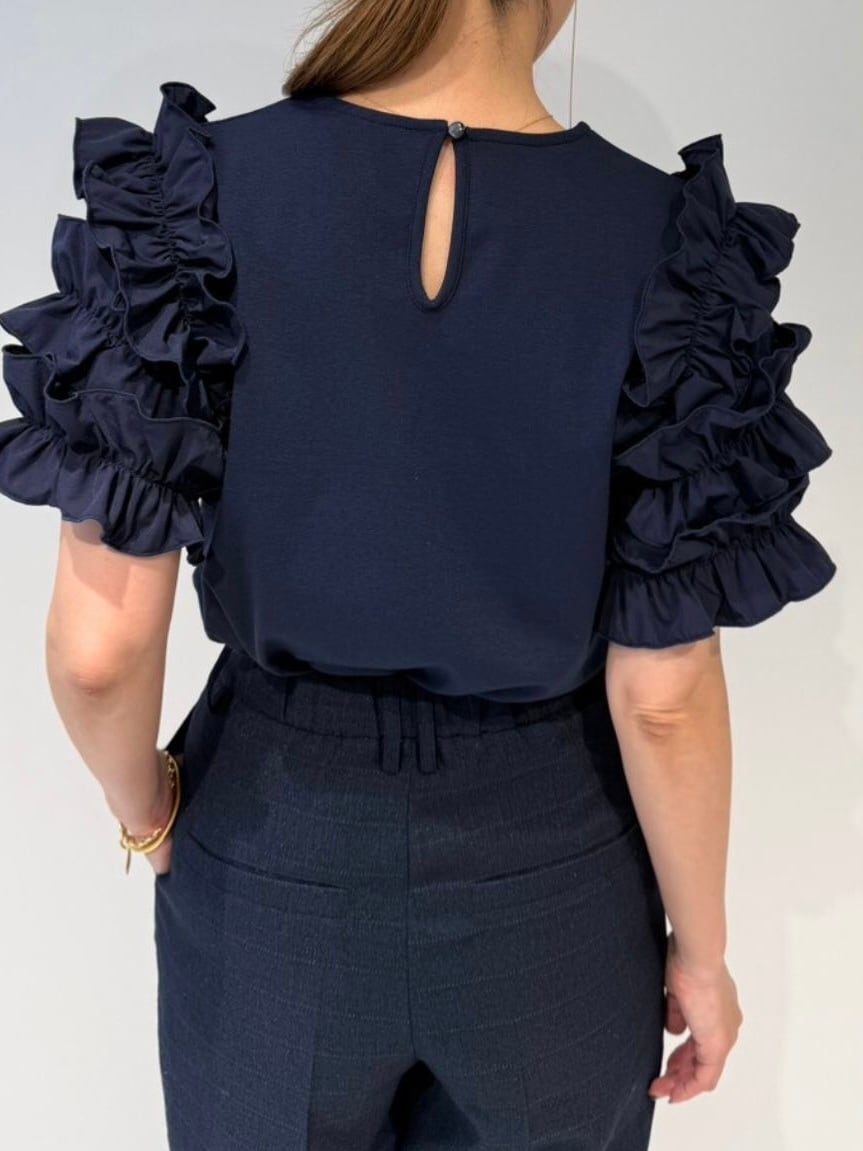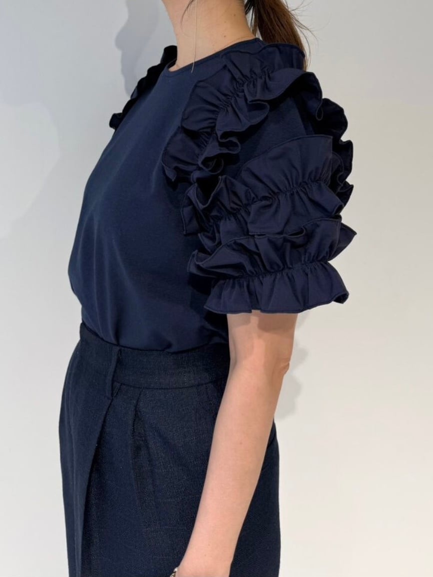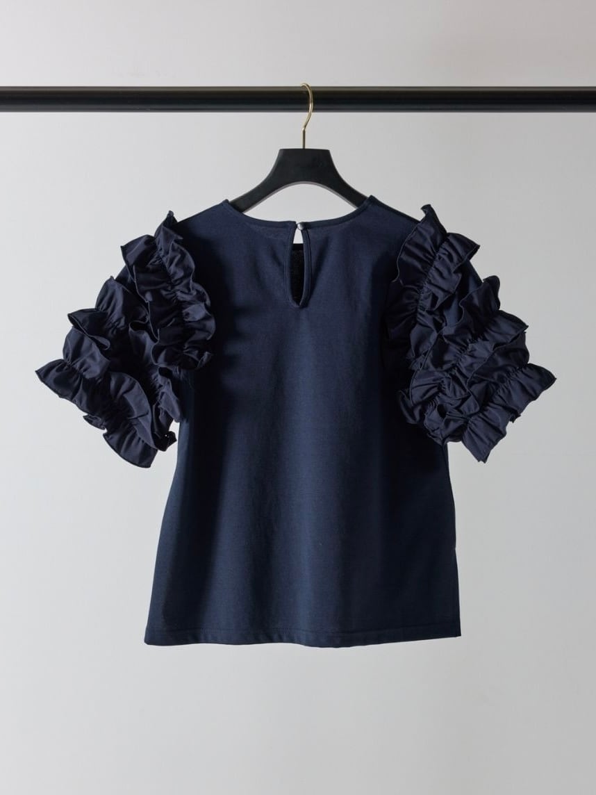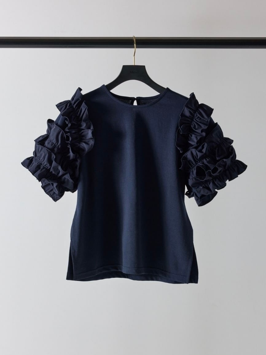 袖には布帛のフリルを重ね、華やかさを添えながらも、ワントーンでまとめることで甘さを抑えた大人の印象に仕上げました。