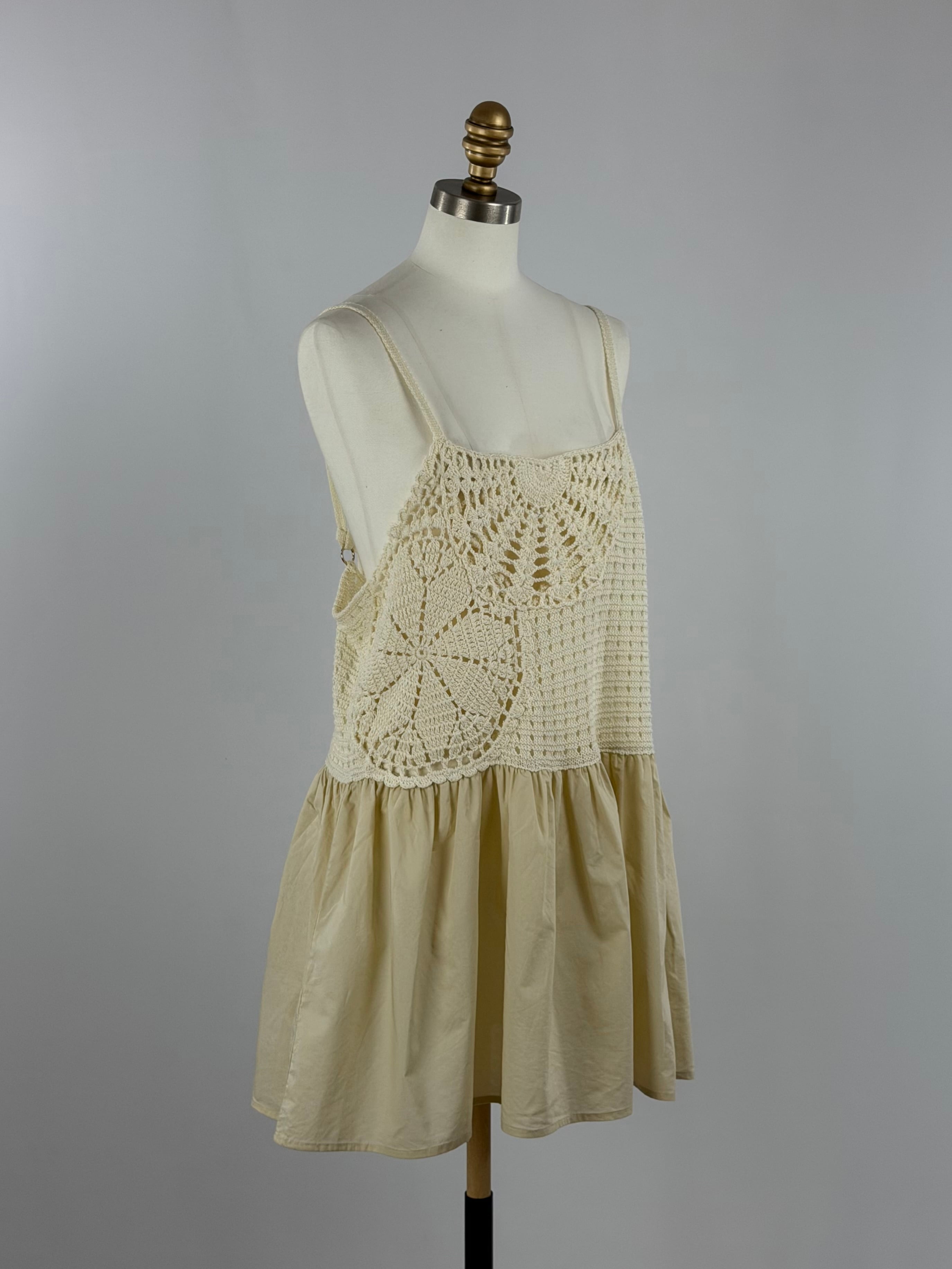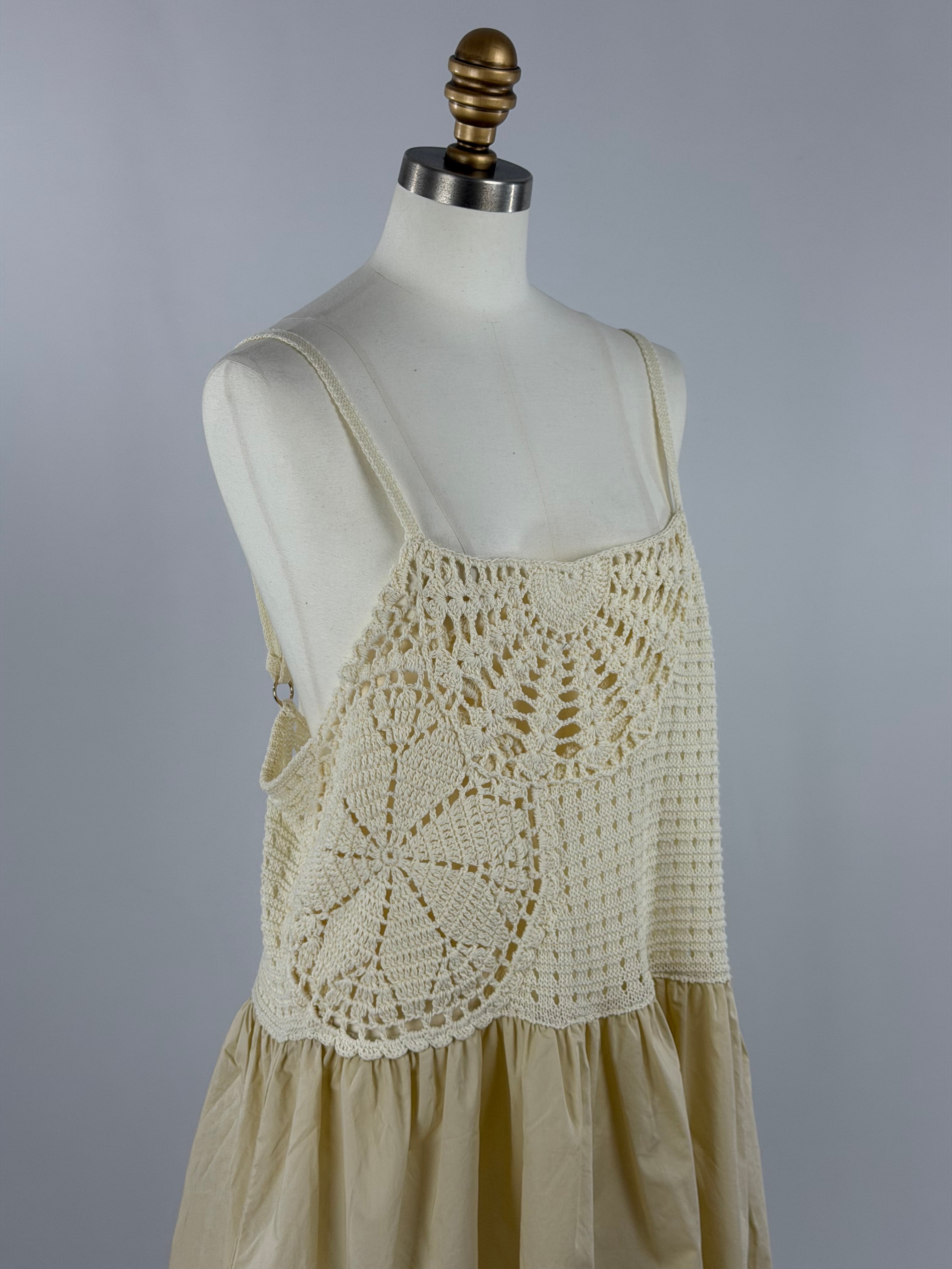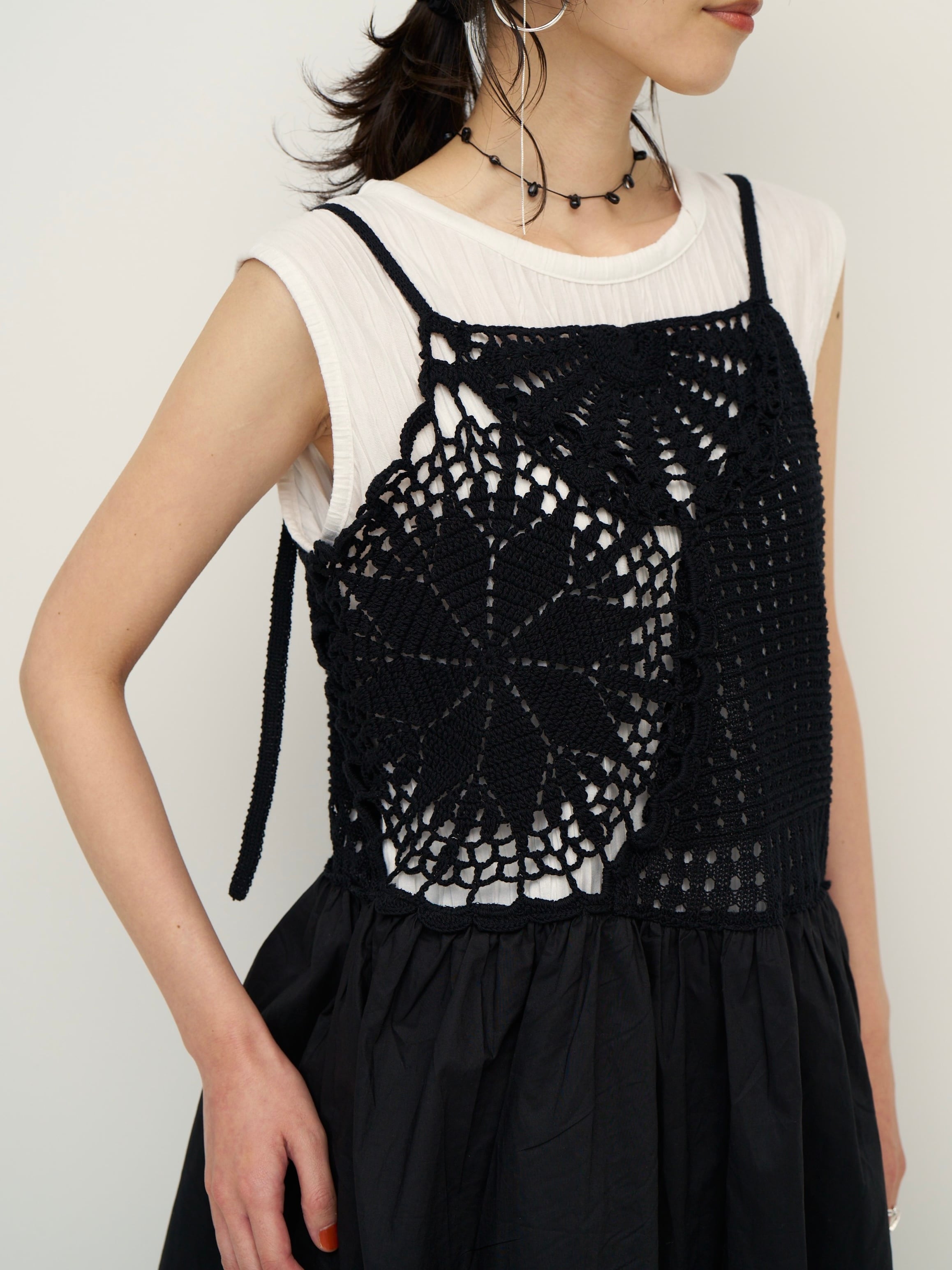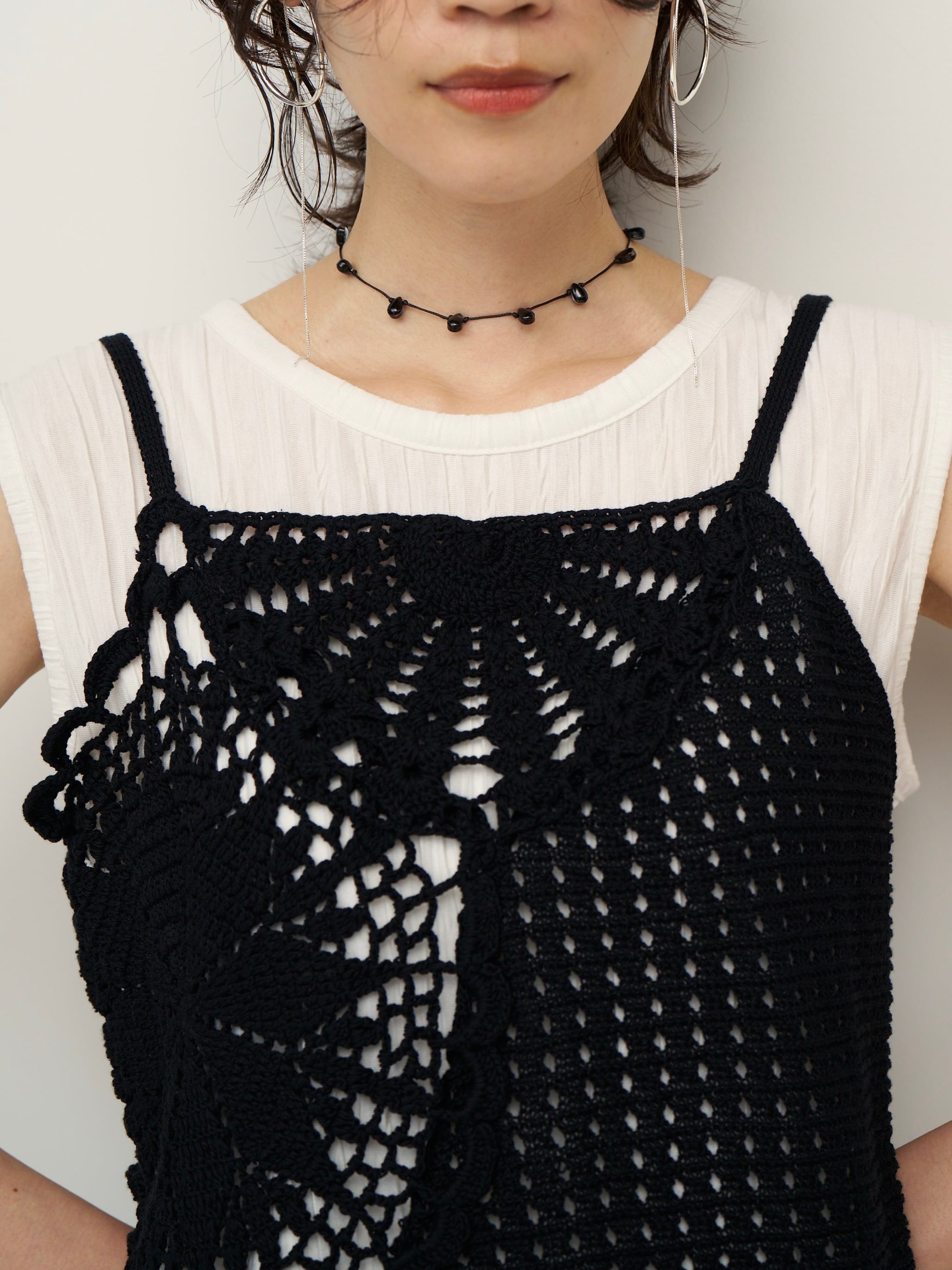 手編みのかぎ針編みが目を引く、存在感のあるプラスワンキャミソールトップス。