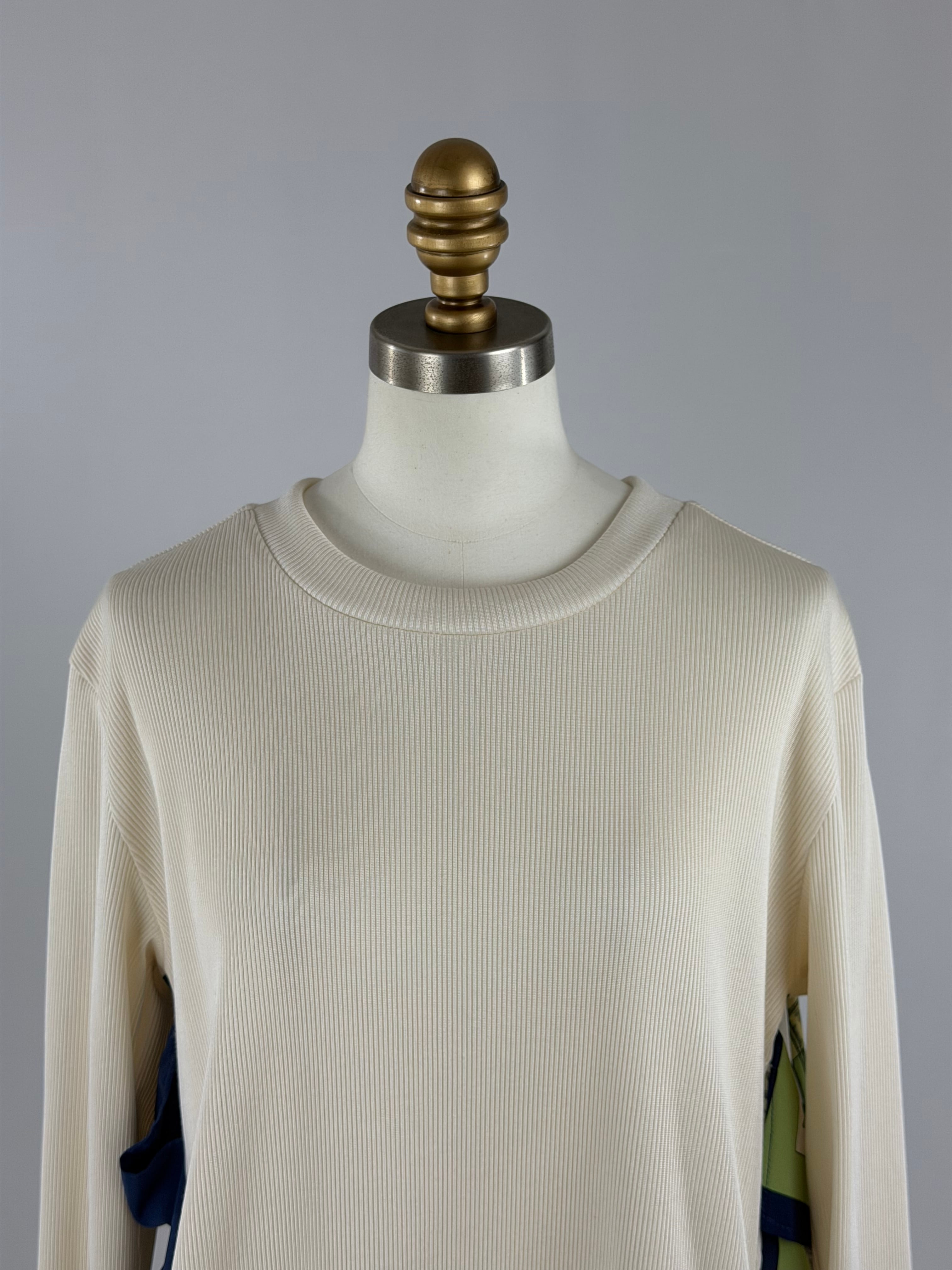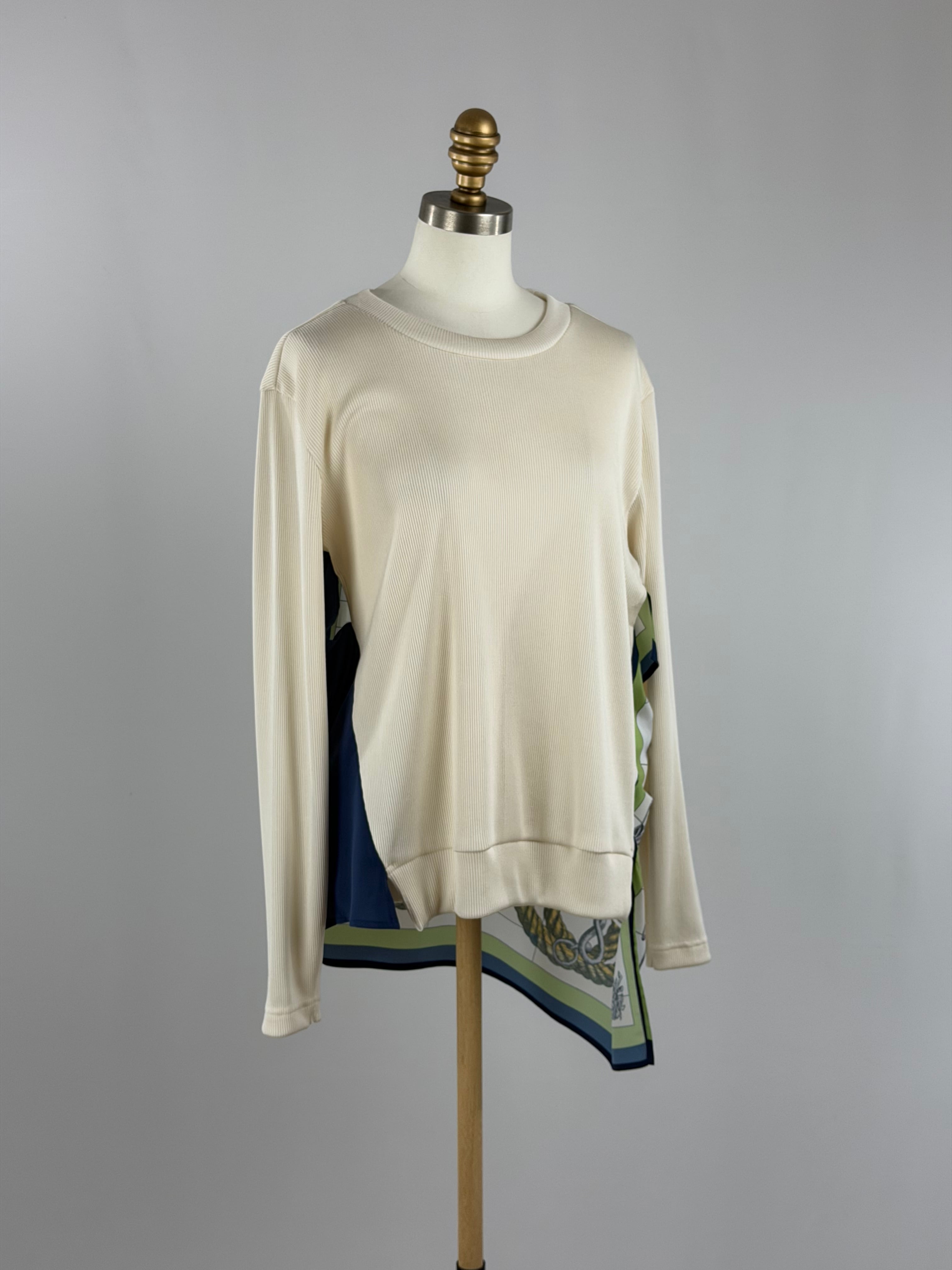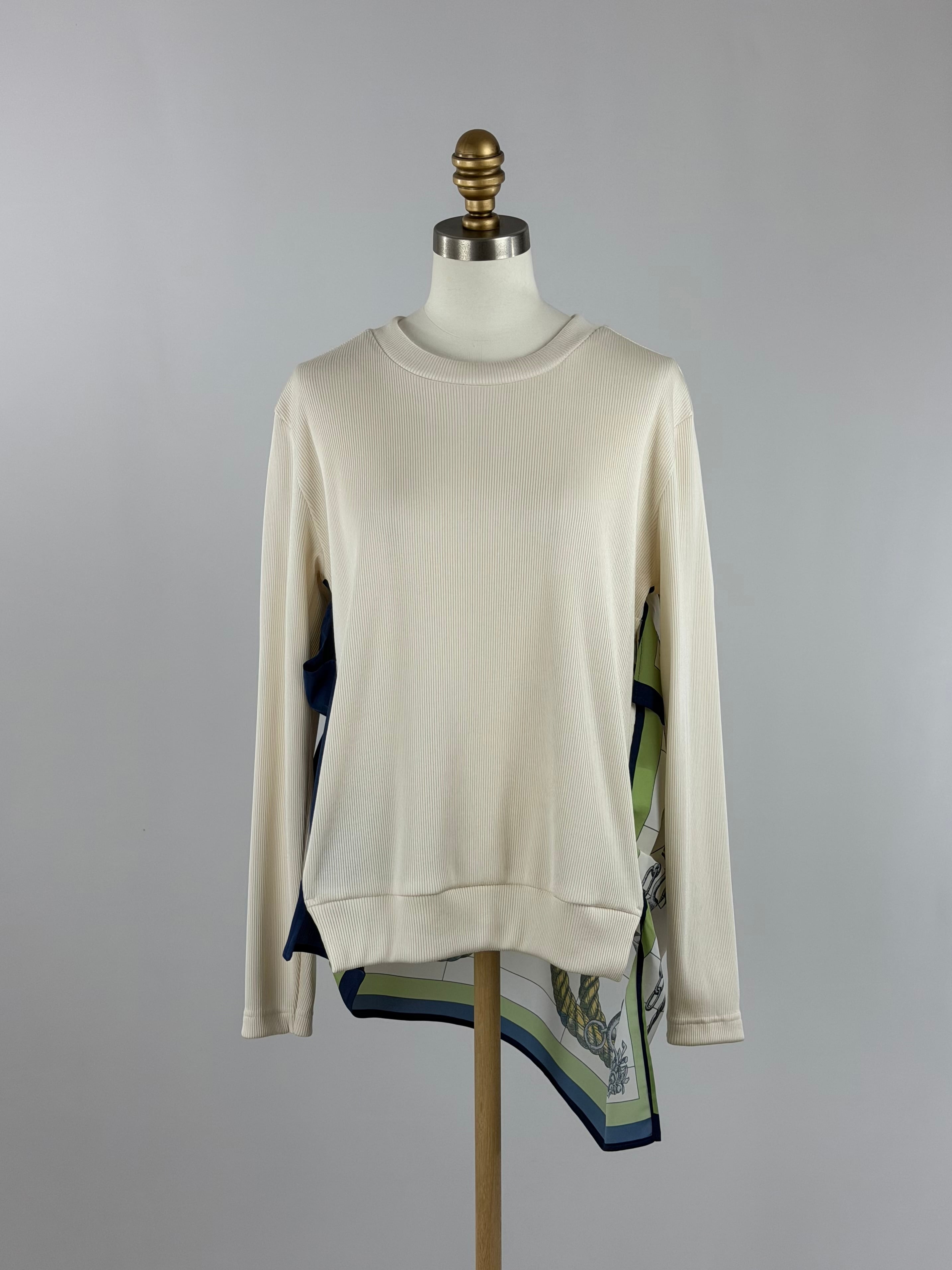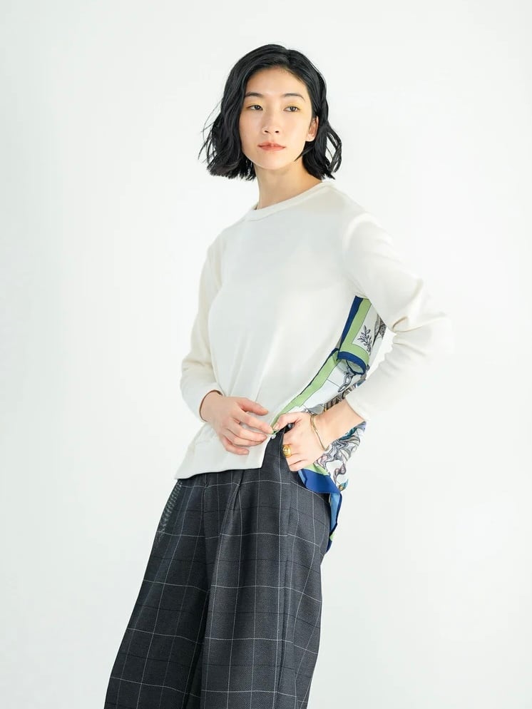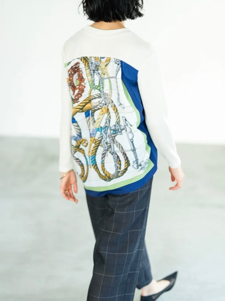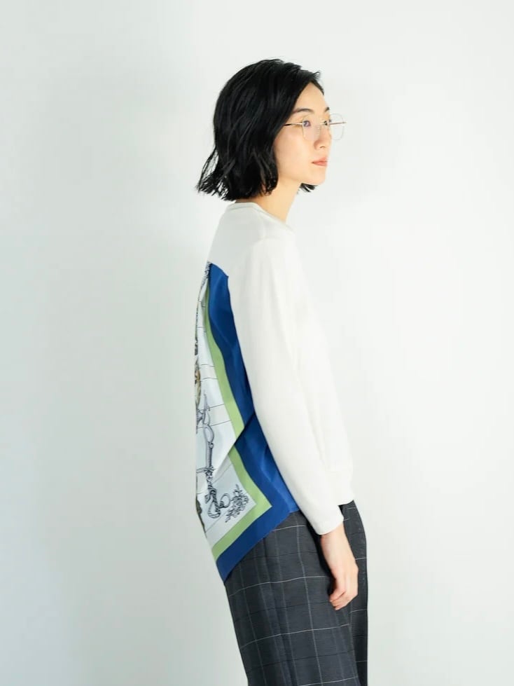 光沢のあるリブニットソーにブランド別注のスカーフ生地をドッキングした後ろ姿が印象的な一枚。