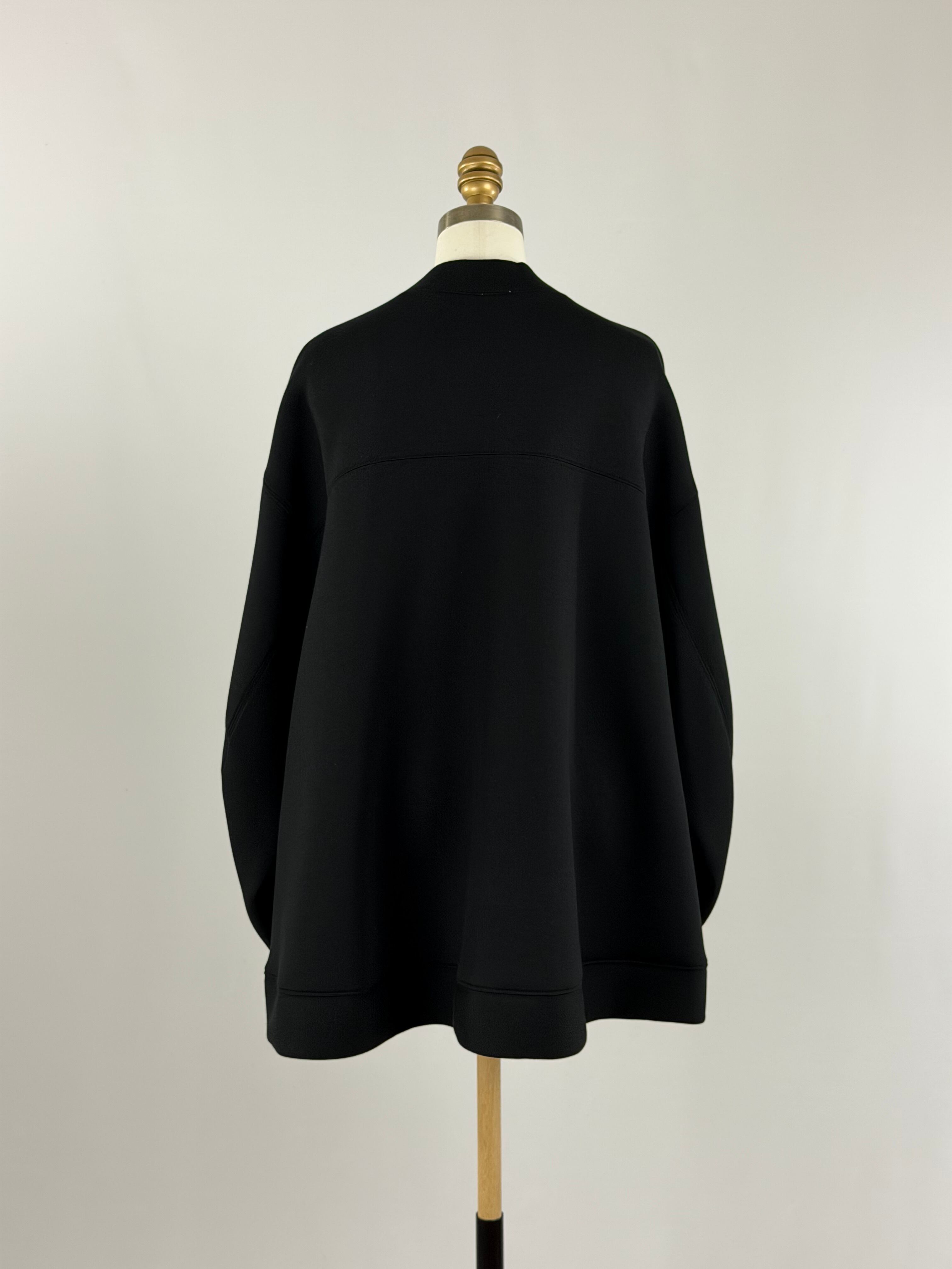 袖山の切り替えで作る膨らみや後のたっぷりとしたフレアシルエットで作る立体的なシルエットがポイントで、モードな印象に仕上げました。