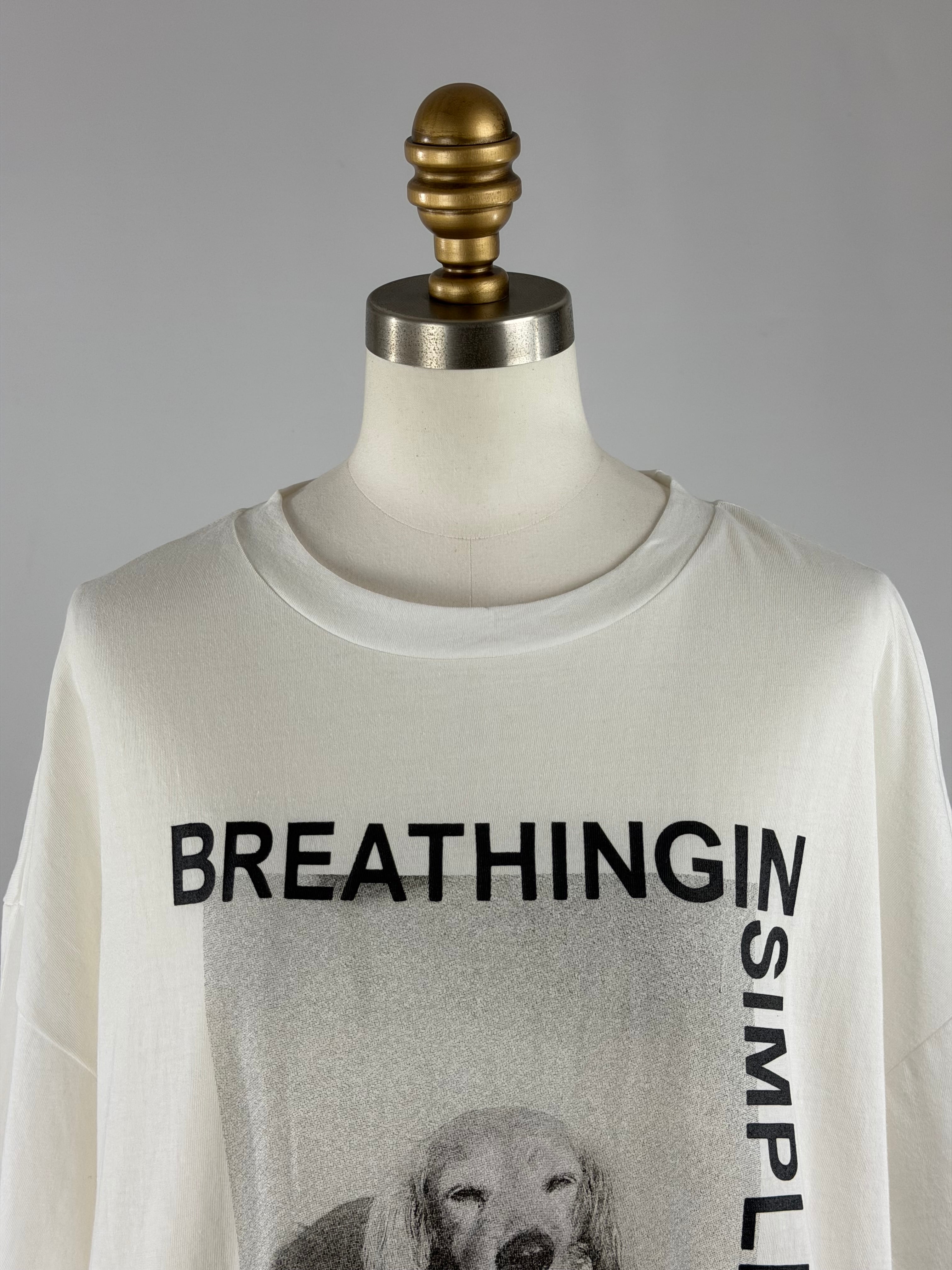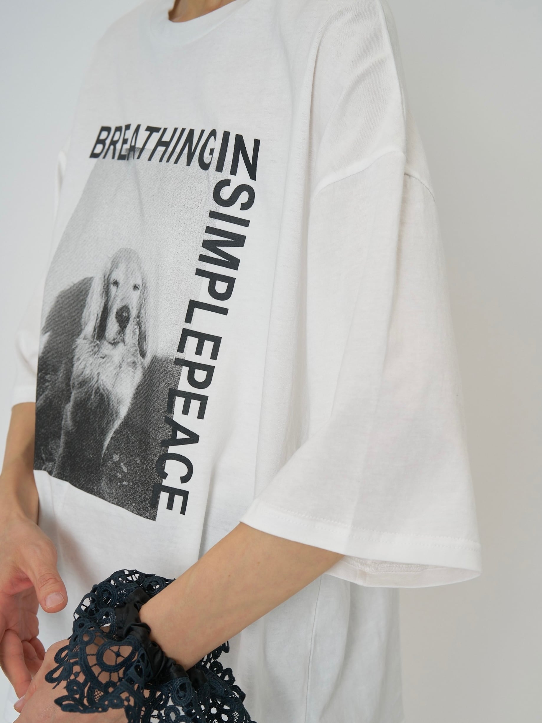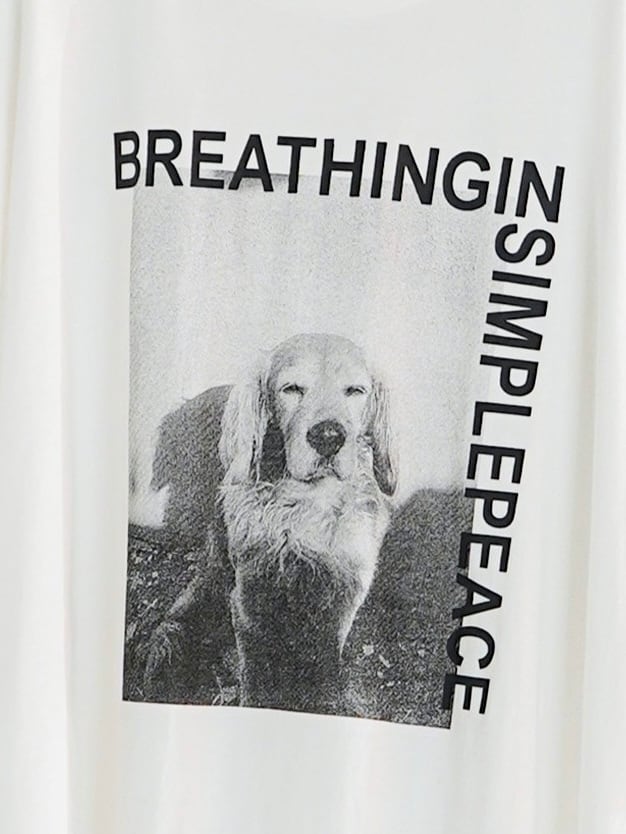 ゆるい印象を与える犬に、BREATHING IN SIMPLE PEACE=”穏かな平和を深く吸い込む” を添えて。