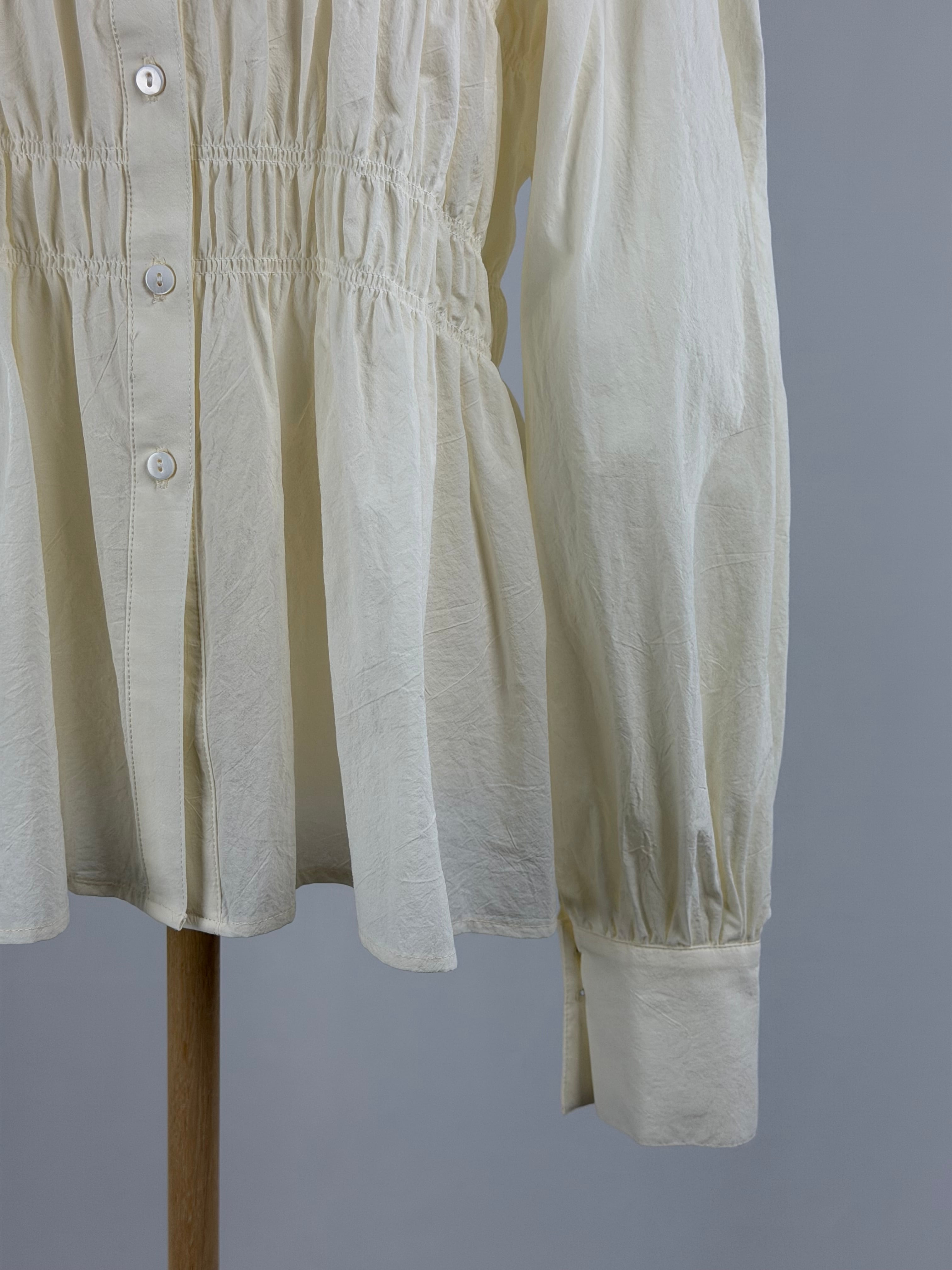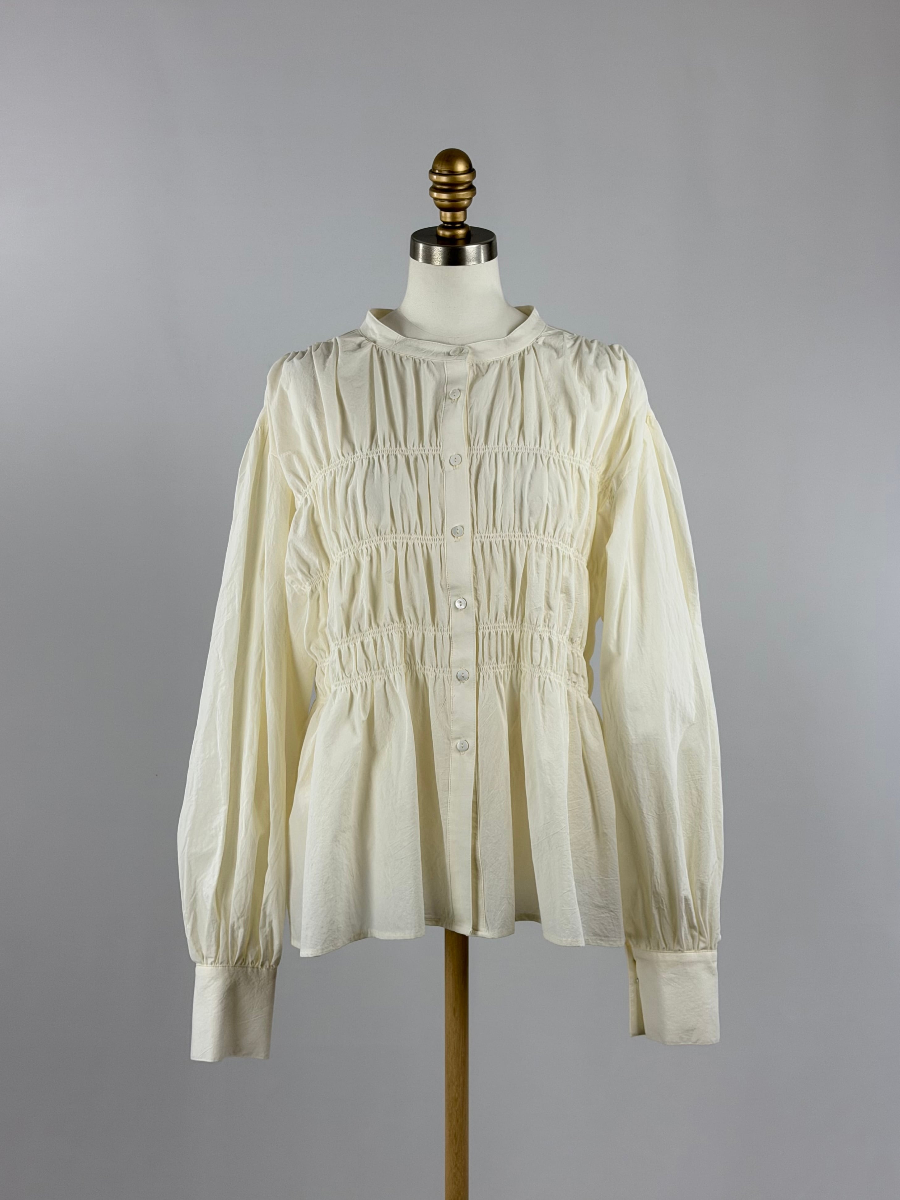 コットン素材を使用した、シャーリングデザインのブラウス。