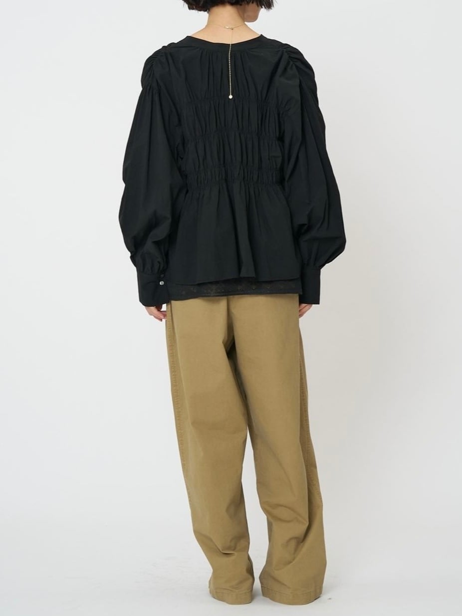 コットン素材を使用した、シャーリングデザインのブラウス。