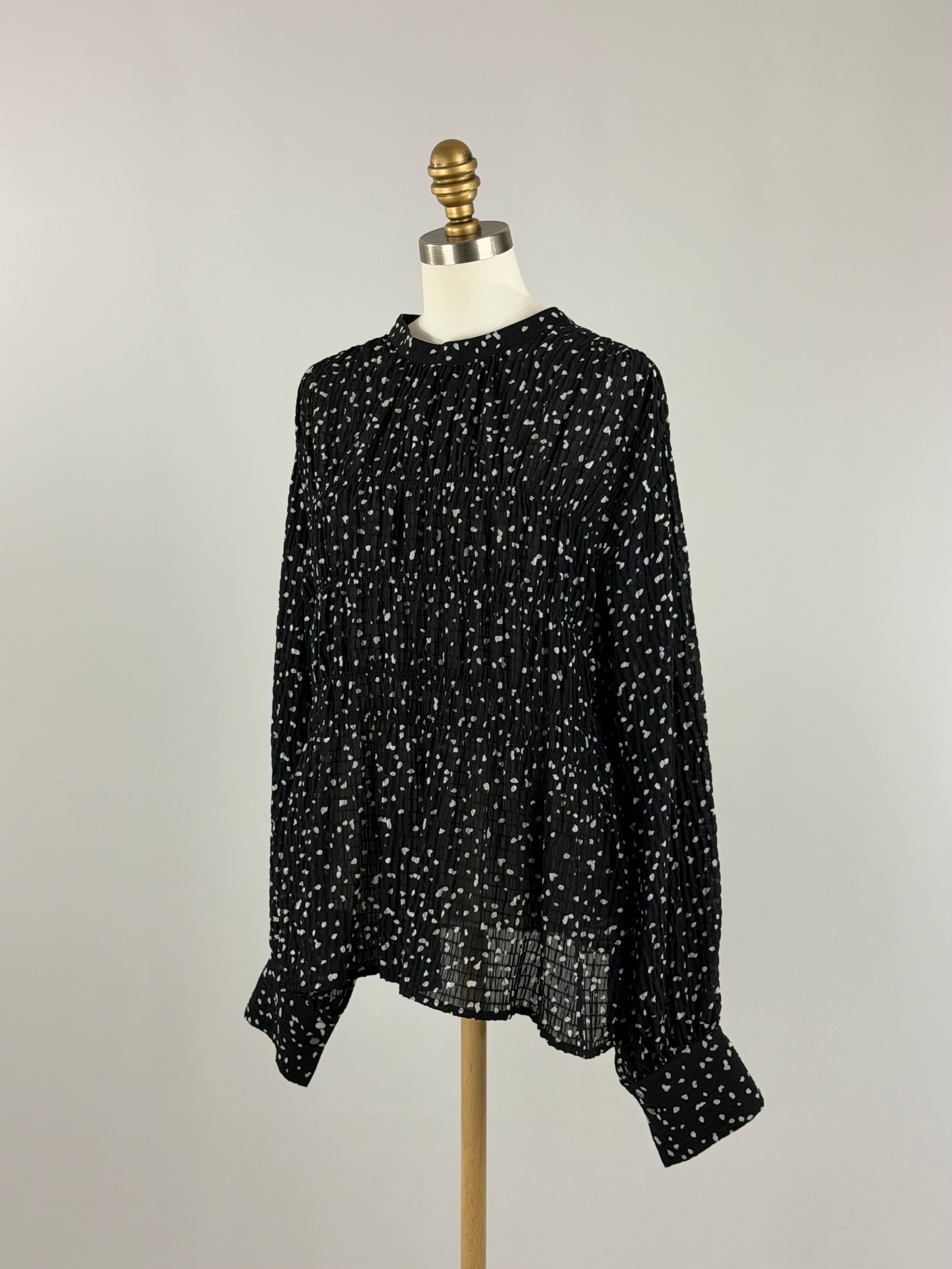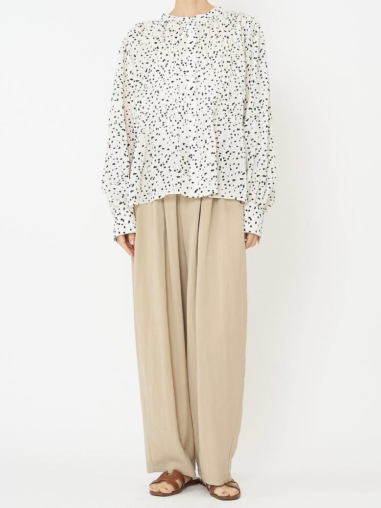 ドット柄を使用した、シャーリングデザインのブラウス。