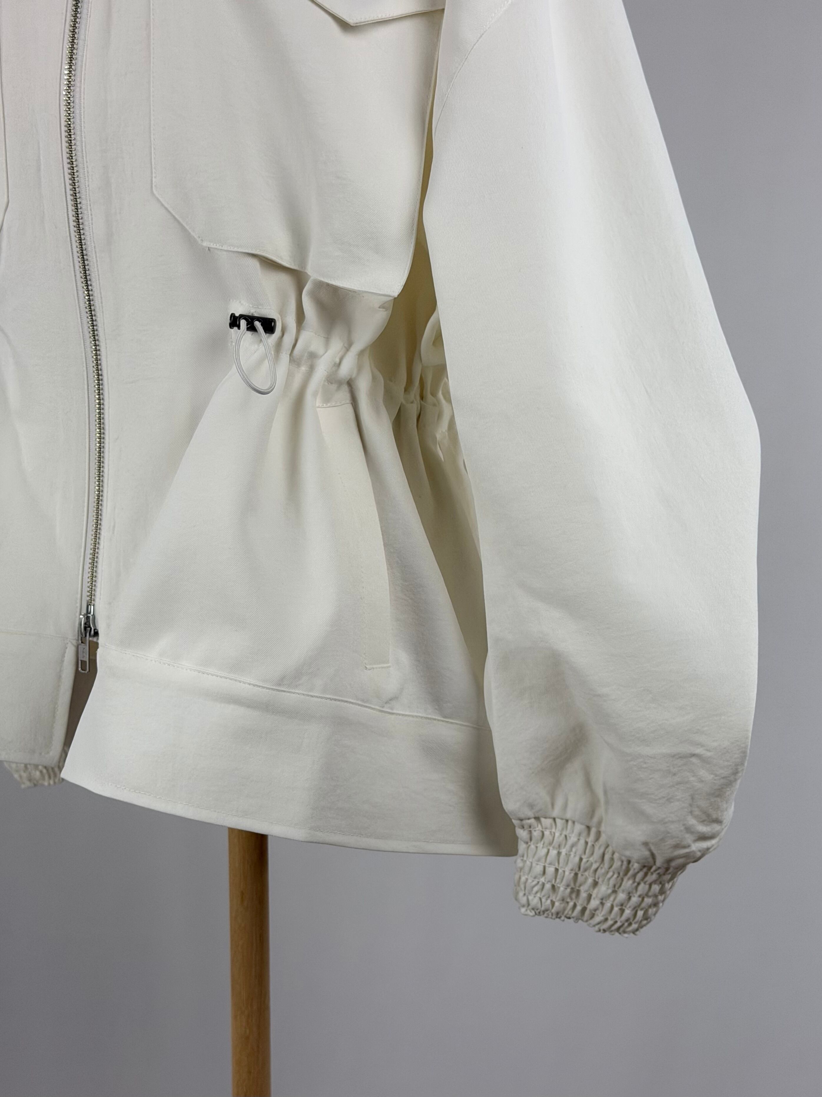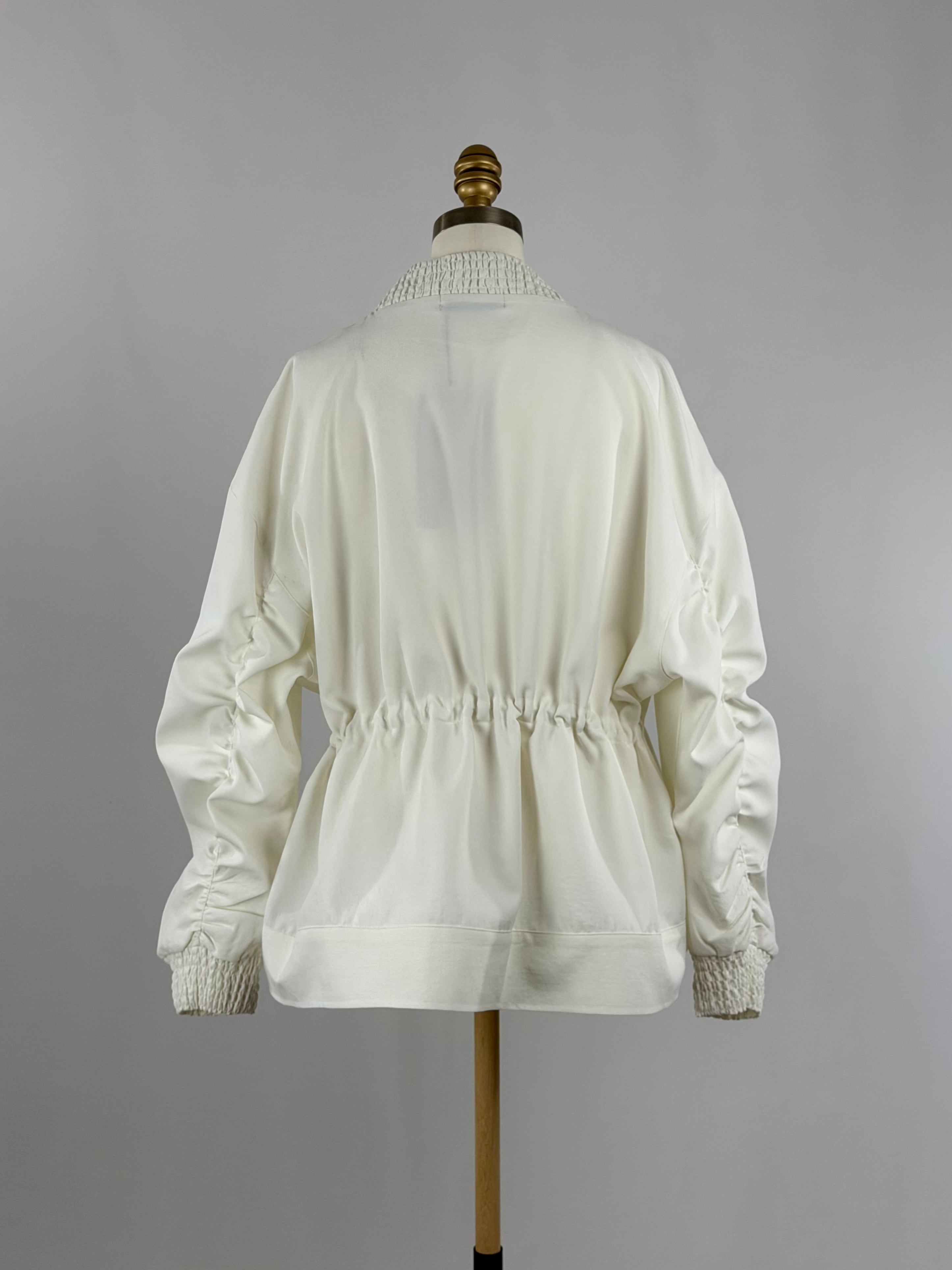 ギャザーを施しつつカーブさせた袖、ウエストのドローコードを絞ることでペプラムシルエットを構築、フライトジャケットをモチーフにフェミニンな要素を加えました。