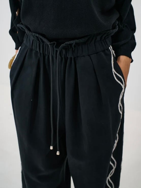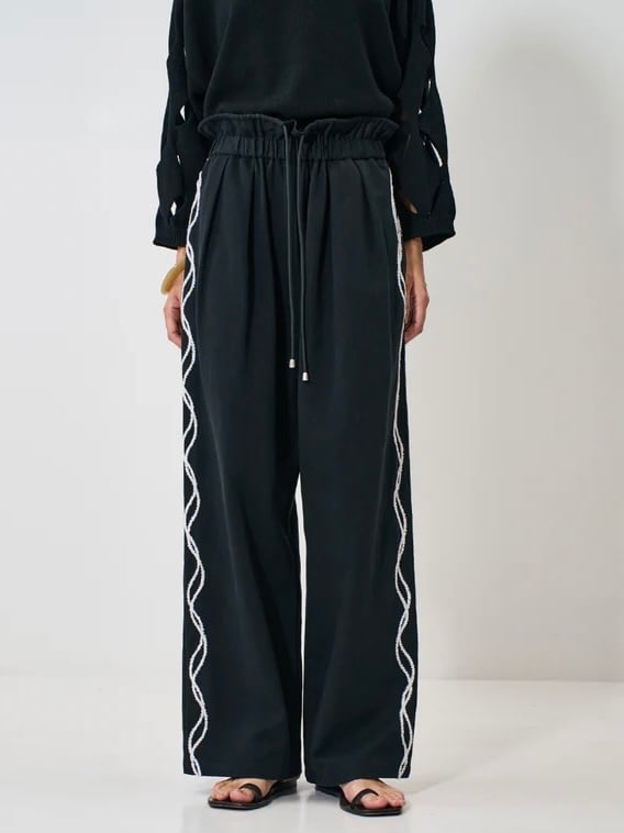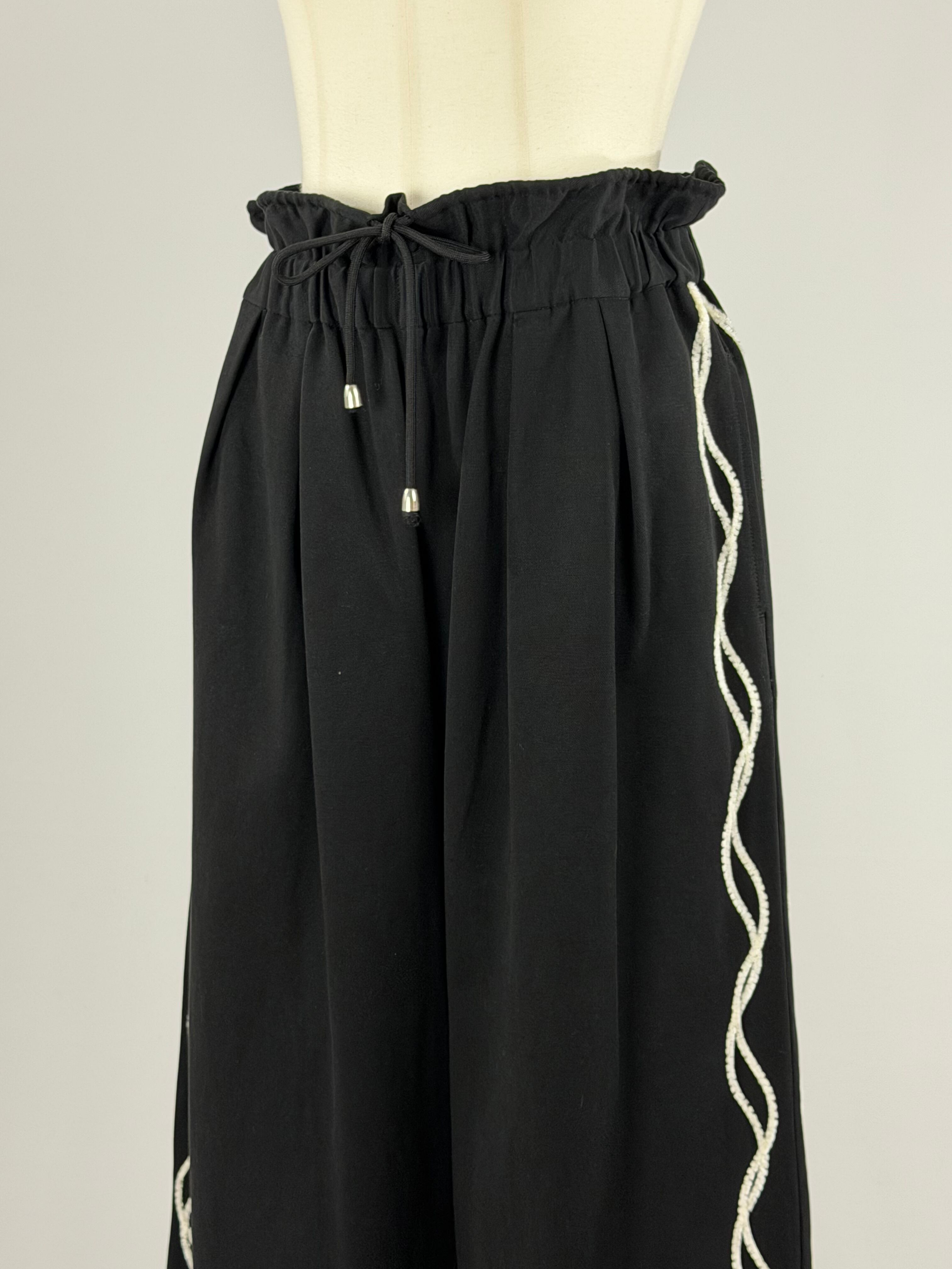ウエストにドロストデザインを取り入れたワイドパンツ。
