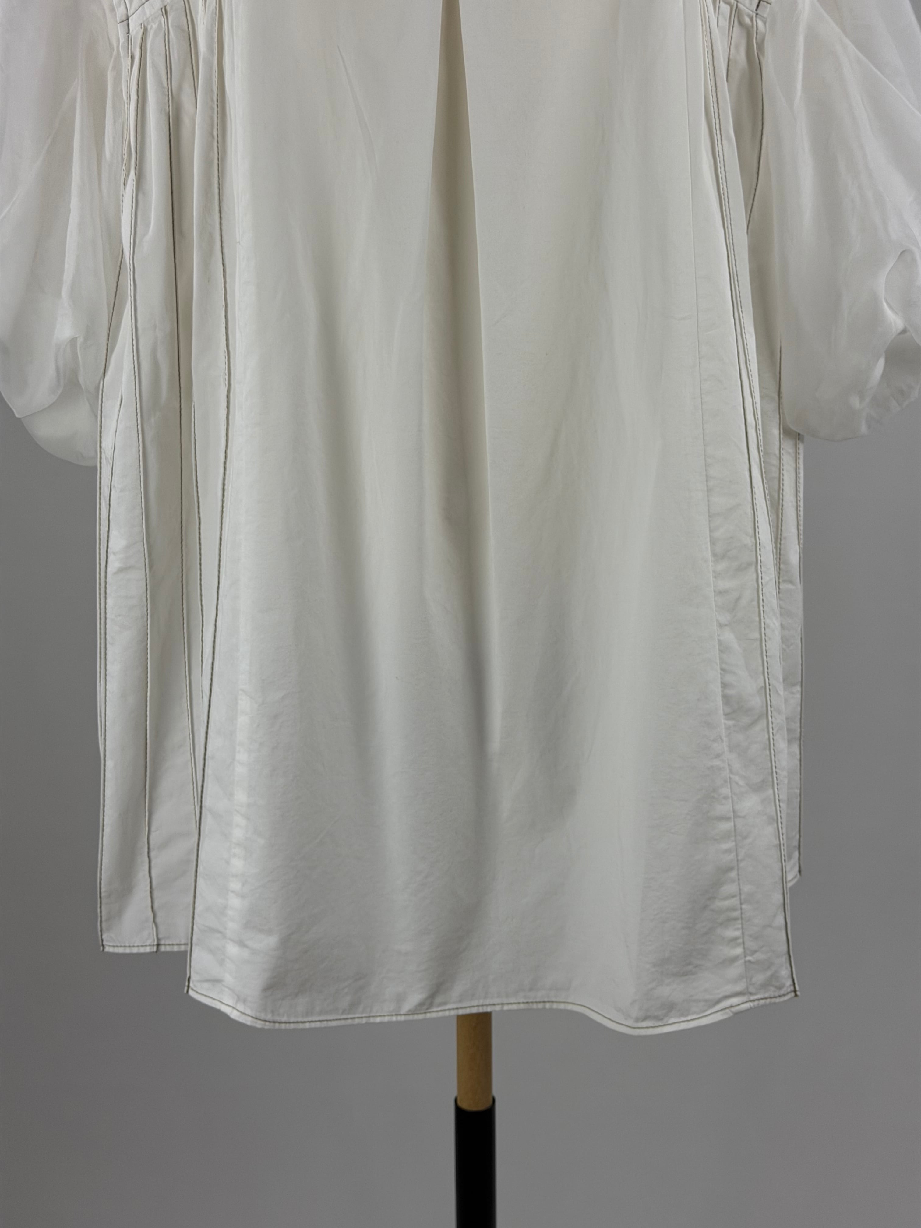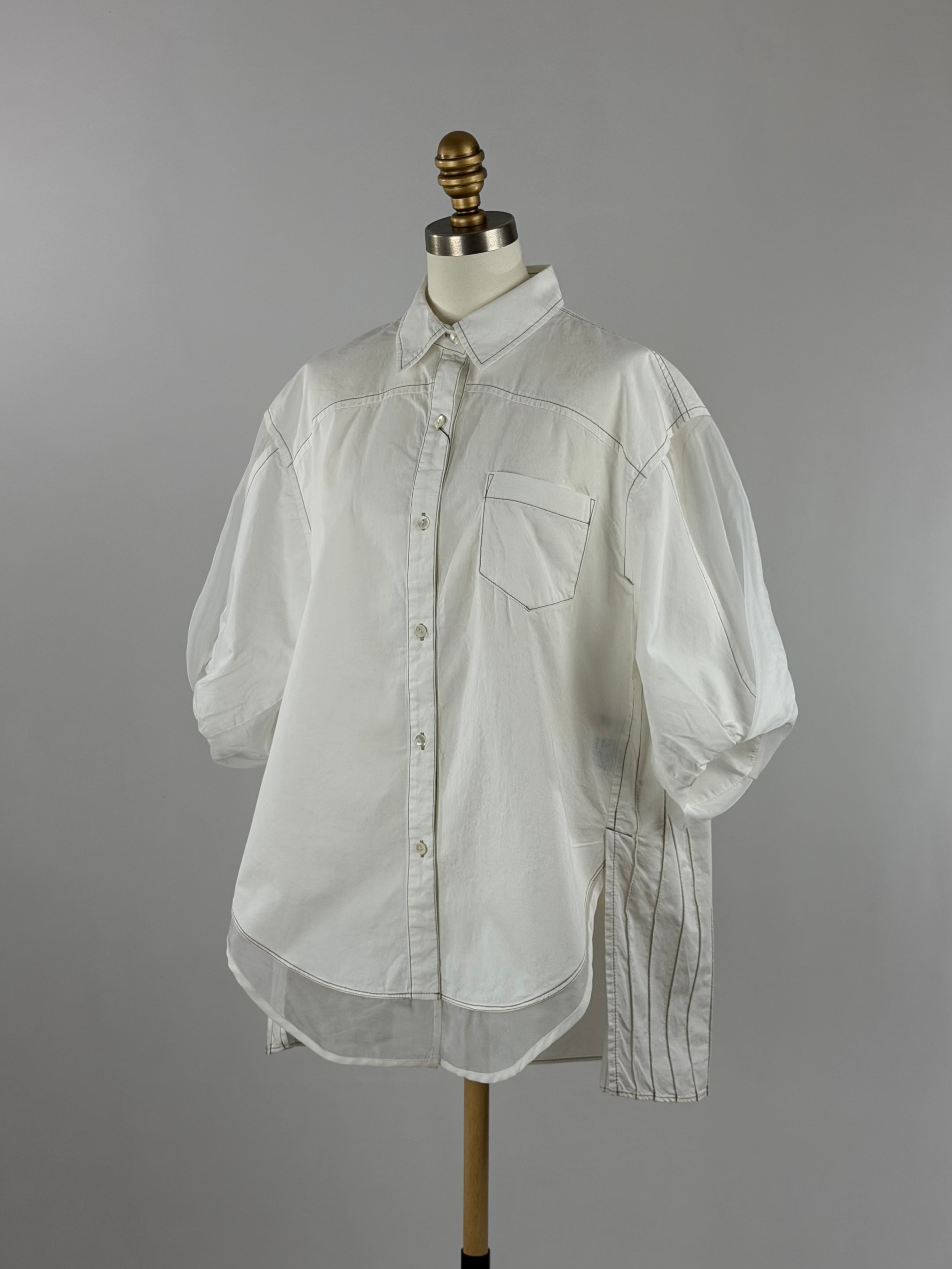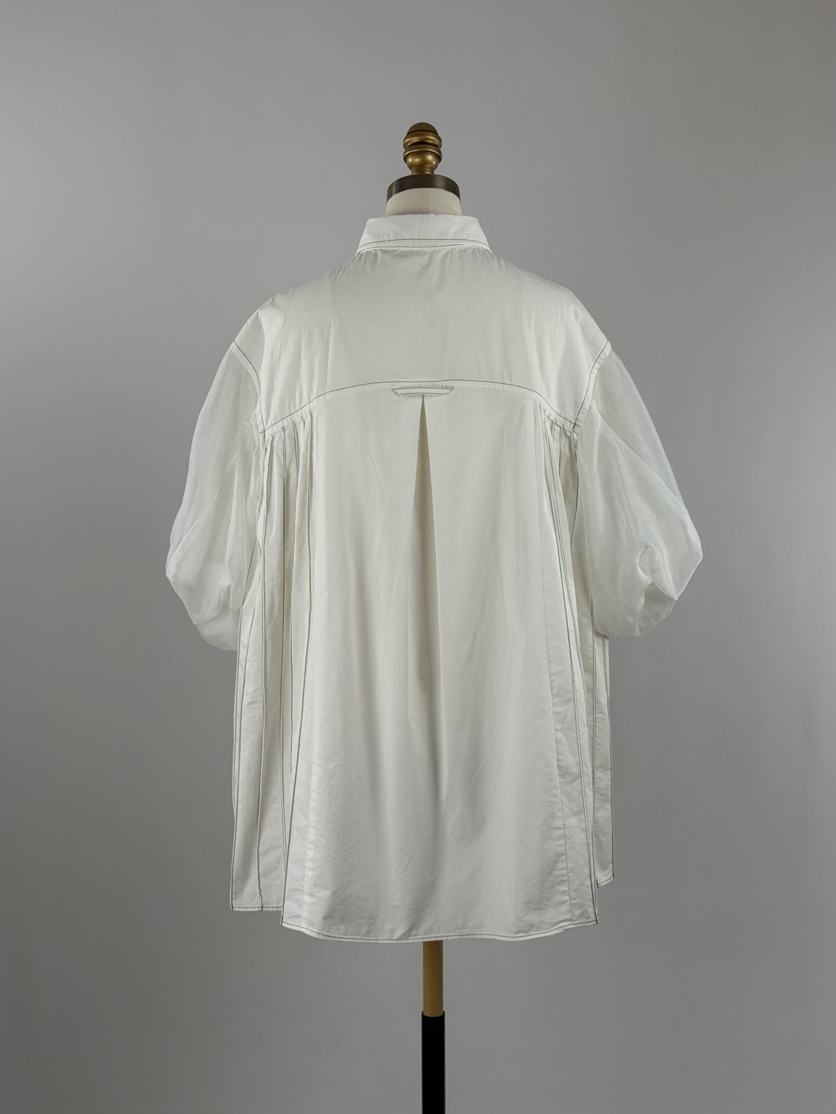 洗い加工を施した生地と、バルーン袖がアイコニックなハーフスリーブシャツ。