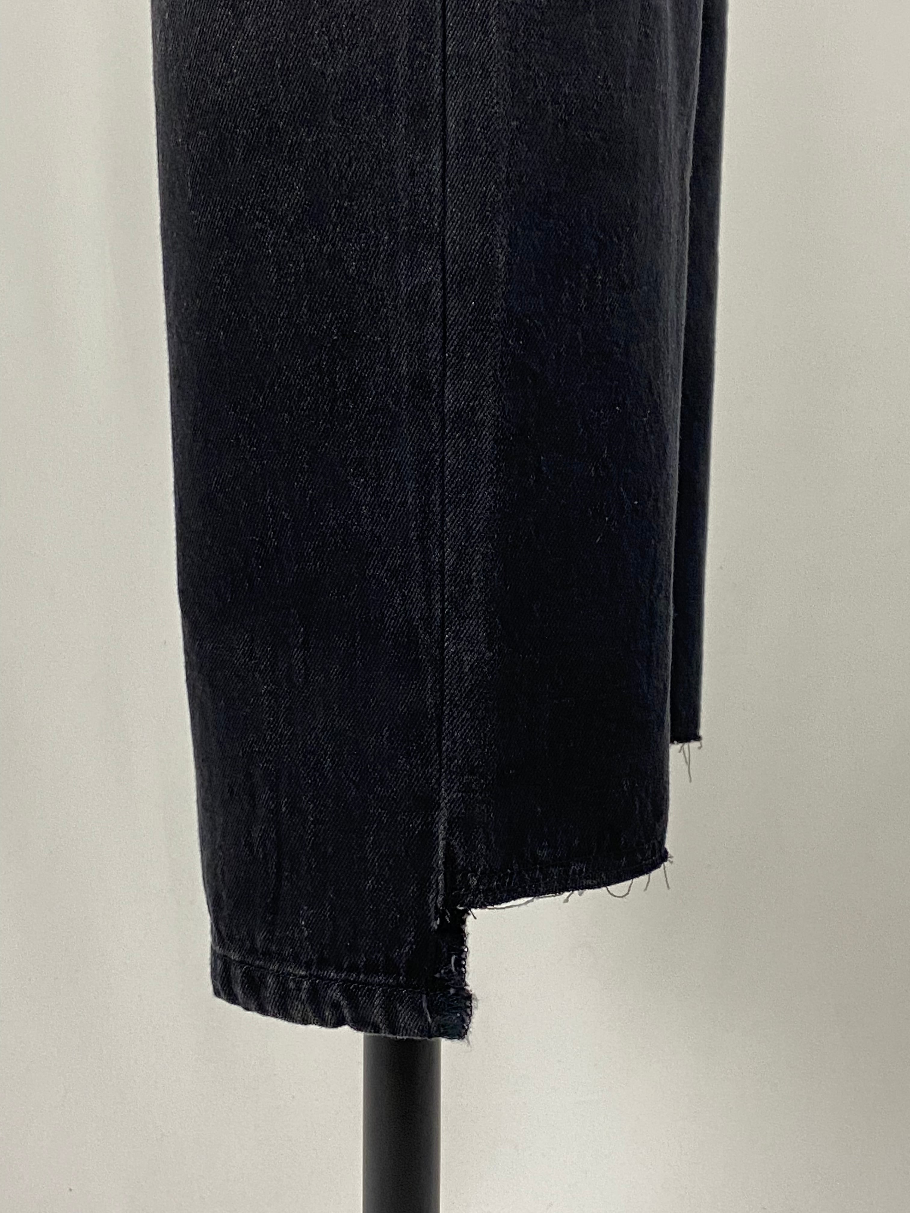 定番のタックワイドデニムと同様に、裾の前が長く後が短い段違いになっていて、パンツの裾を引きずりにくい、かつ足長効果を生むデザインです。