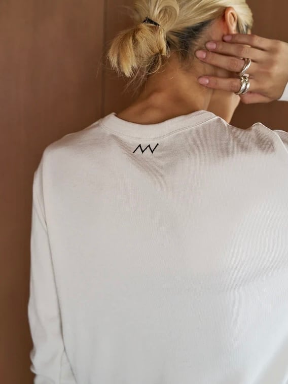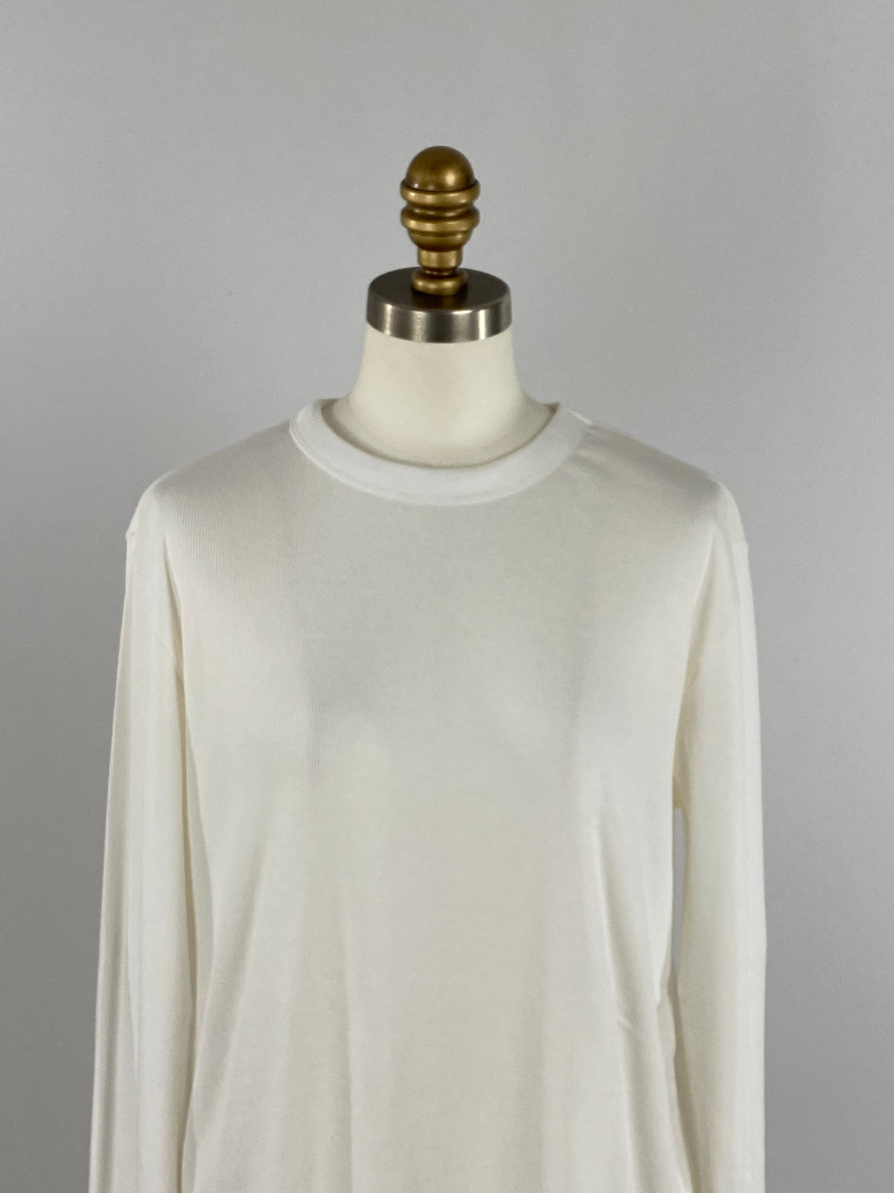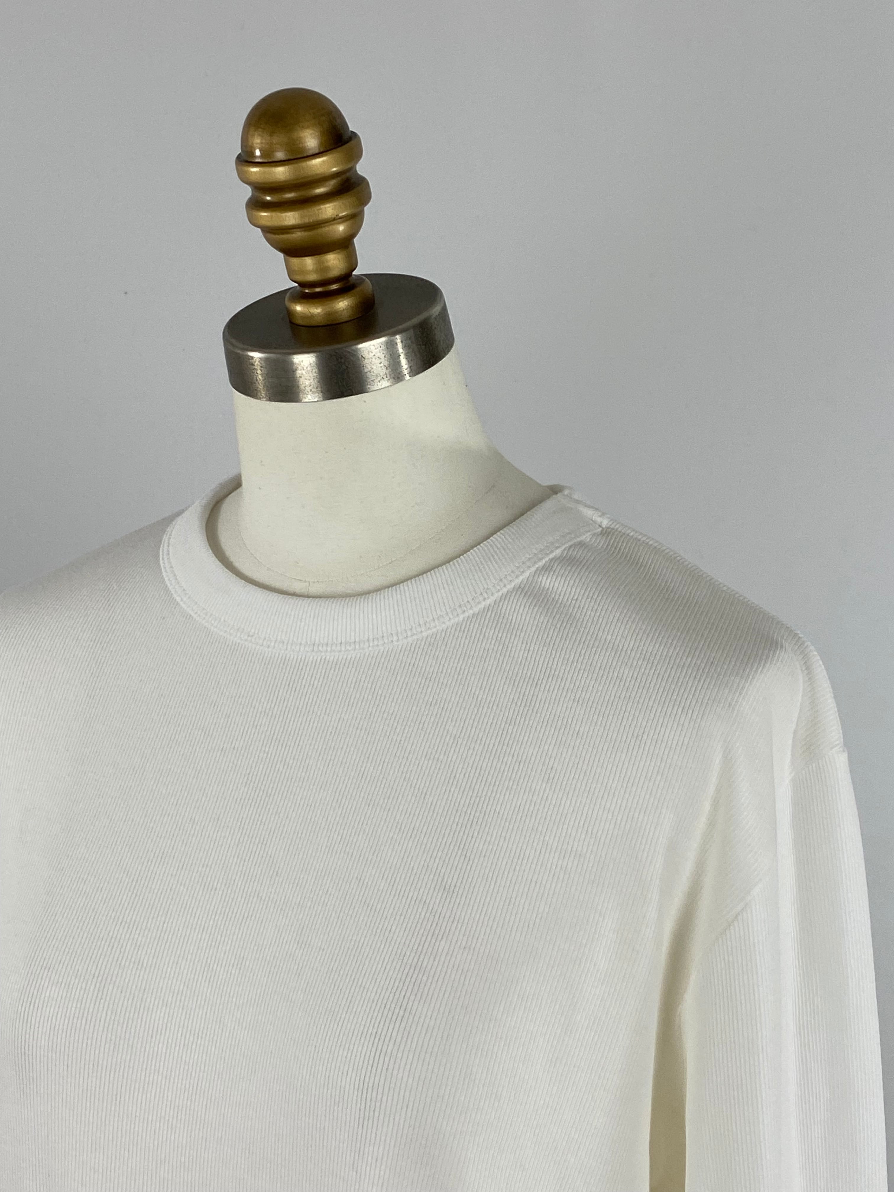 繊細な綿素材のリブ生地を使用。通常の糸と比較して格段に毛羽が少なく、シルクのような光沢や滑らかさがでるというのが特徴のコンパクトヤーンを使用したリブ生地を採用。