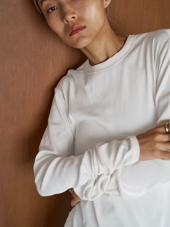 衿ぐりはあえて狭く設定、ニットやシャツの下に着たときに衿ぐりからTシャツを覗かせるスタイリングがおすすめの着こなしです。
